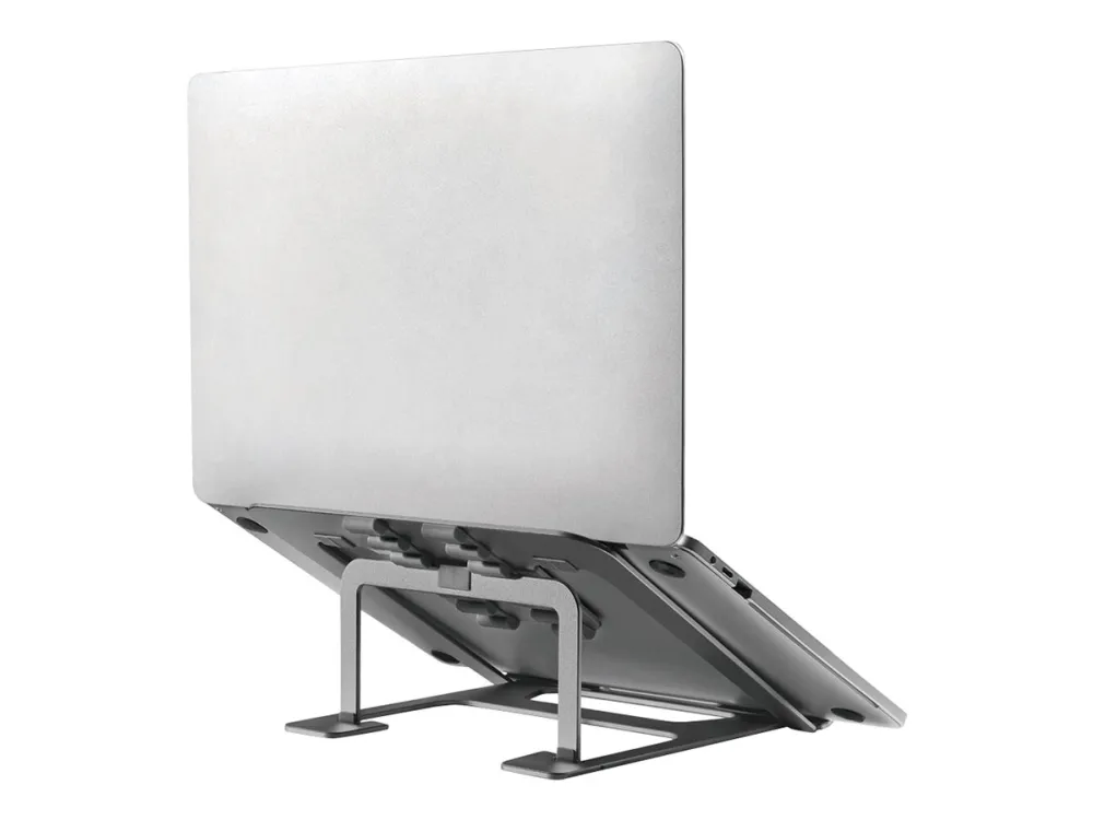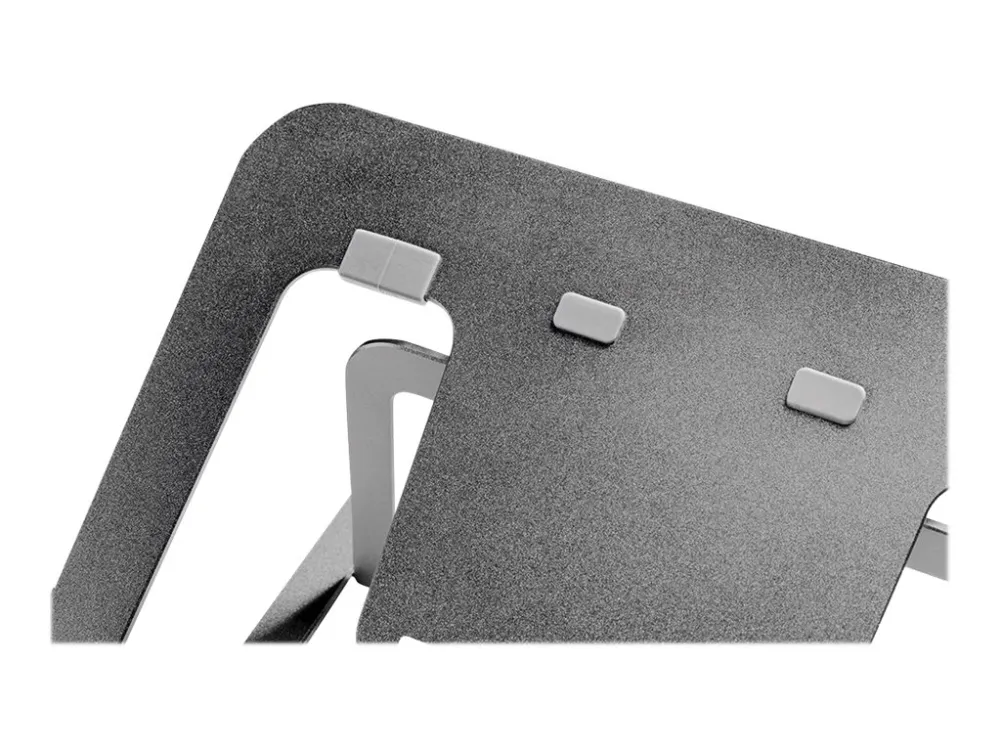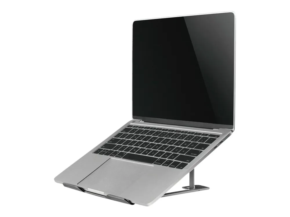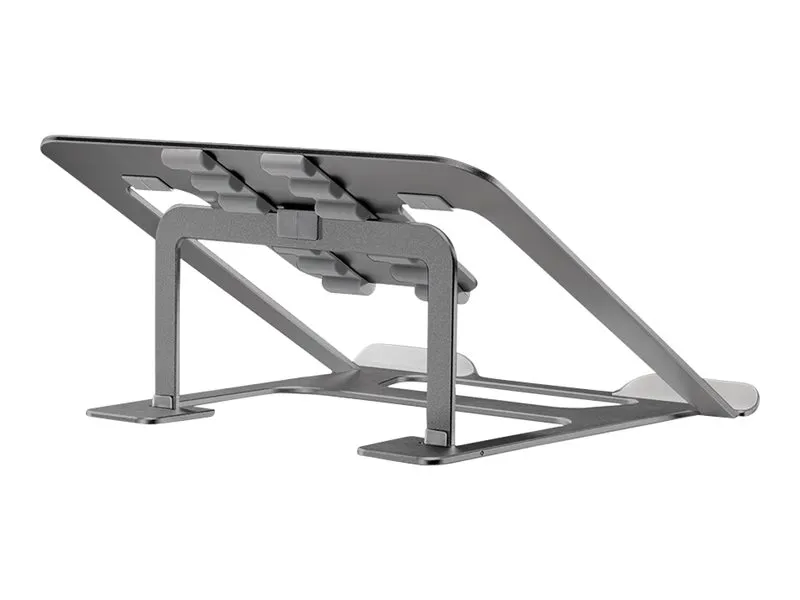 The Neomounts NSLS085GREY is a universal stand for laptops from 10" up to 17", with a maximum weight capacity of 5kg. The stand has six different height positions and a ultra-slim folding design. The lightweight, compact design makes the stand ideal to take with you wherever you want. The open configuration ensures good ventilation of the laptop and the anti-skid silicon pads and safety ledge stopper ensure solid positioning.