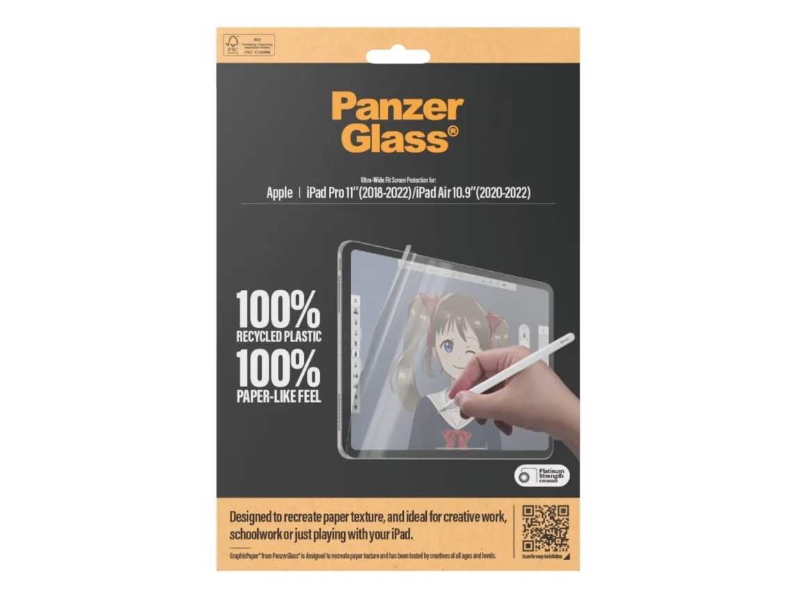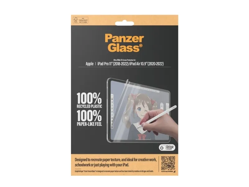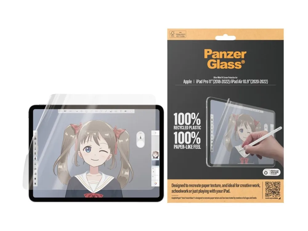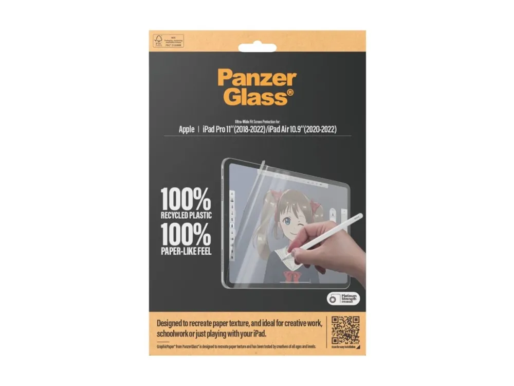 Introducing our updated award-winning GraphicPaper screen protector, now with 100% recycled plastic. It is designed to recreate the texture of paper while also protecting your tablet from the hazards of everyday life. Tested by creatives of all ages and levels, it is ideal for creative work, school work, note-taking, sketching, drawing, or simply playing games. The screen protector is scratch and shock-resistant and even features a smudge-free coating. The Ultra-Wide Fit screen protector covers the entire front surface of your tablet while still leaving room for a case. It provides a clear view of your screen and comes in FSC-certified packaging that can be recycled.