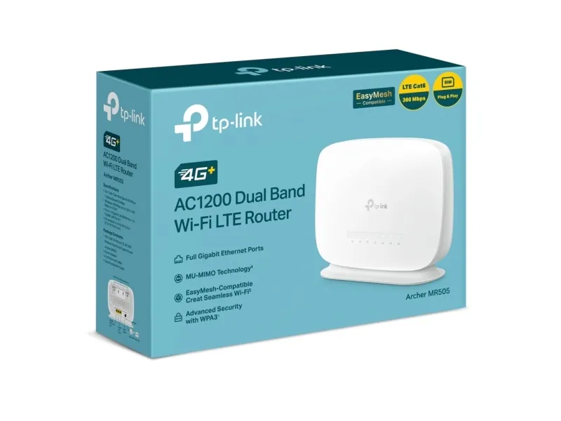 Easy Setup and Use Set up the Archer MR505 in minutes thanks to its intuitive web interface and the powerful Tether app. Manage network settings, including Parental Controls and Access Control, from any Android or iOS device. Tether also provides Automatic Firmware Updates to always give your network the latest performance and security.TP-Link Archer 4G+ Cat6 AC1200 Wireless Dual Band Gigabit Router. Wi-Fi band: Dual-band (2.4 GHz / 5 GHz), Top Wi-Fi standard: Wi-Fi 5 (802.11ac), WLAN data transfer rate (max): 1200 Mbit/s. Ethernet LAN interface type: Gigabit Ethernet, Ethernet LAN data rates: 10,100,1000 Mbit/s, Cabling technology: 10/100/1000Base-T(X). Mobile network generation: 4G, 3G standards: DC-HSPA+, HSPA+, UMTS, 4G standard: LTE-TDD & LTE-FDD. Security algorithms: 64-bit WEP, 128-bit WEP, WPA, WPA3. Product type: Desktop/pole router, Product colour: White