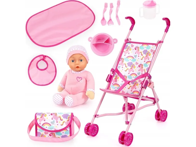 Dette skønne dukke-klapvognssæt består af en sammenklappelig metalvogn, en 30 cm blød dukke, en farvekoordineret skuldertaske, en hagesmæk, bestik med tallerken, en drikkekop og en puslemåtte. Klapvognen er velegnet til dukker op til 46 cm. Den har en dejlig farvekombination og er perfekt til de smås første udflugter med deres dukke. Den integrerede sele beskytter dukken mod at falde ud. Med sine fire dobbelte hjul er den nem at skubbe. Derudover er den også nem at folde sammen og opbevare. Den søde 30 cm dukke med sin bløde krop er ideel til rollespil, som kan realiseres med det medfølgende tilbehør til madning samt puslemåtten. Sættet er perfekt som startsæt til alle små dukkeforældre. Klapvognen kan foldes sammen til transport eller opbevaring Håndtagshøjde: 57 cm Klapvogn Strørrelse: 46 x 27 x 57 cm Alder: Fra 3 år Bayer Design er producent af dukker, dukkevogne og dukketilbehør som har bragt glæde og underholdning til generationer af børn med deres produkter af høj kvalitet. Deres dybe passion for det, de gør, kommer til udtryk i deres engagement i fremragende håndværk og upåklagelig kvalitet. Bayer Designs hovedkontor ligger i hjertet af Tyskland, hvor vi kan se tilbage på en lang tradition for dukkefremstilling. Hver eneste af deres dukker, barnevogne og dukketilbehør er fremstillet med største omhu og sans for detaljer, så de lever op til de høje kvalitetsstandarder, som kunderne forventer af os. Bayer har altid børnenes fantasi og glæde i tankerne. Bayer's mission er ikke bare at fremstille legetøj, men at skabe glæde, kreativitet og uforglemmelige barndomsminder. Hvis du er på udkig efter autentisk, holdbart og sikkert dukkelegetøj, er Bayer Design det oplagte valg.