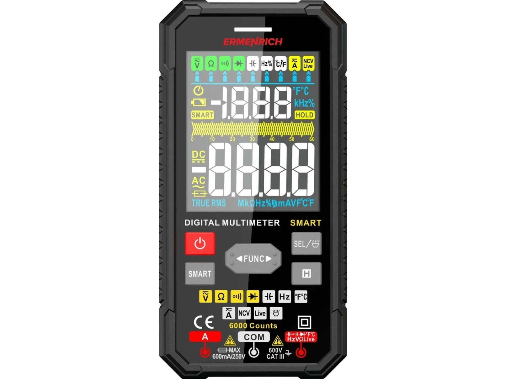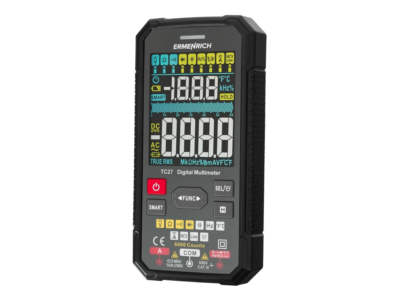 The Ermenrich Zing TC27 digital multimeter is used for testing electrical equipment and electrical circuits. Its broad functionality allows you to use it not only at home but also for professional work. The multimeter is an excellent choice for engineers, electricians, repairmen, and other technicians. The Ermenrich Zing TC27 multimeter is a True RMS device that guarantees highly accurate measurements of non-sinusoidal signals.