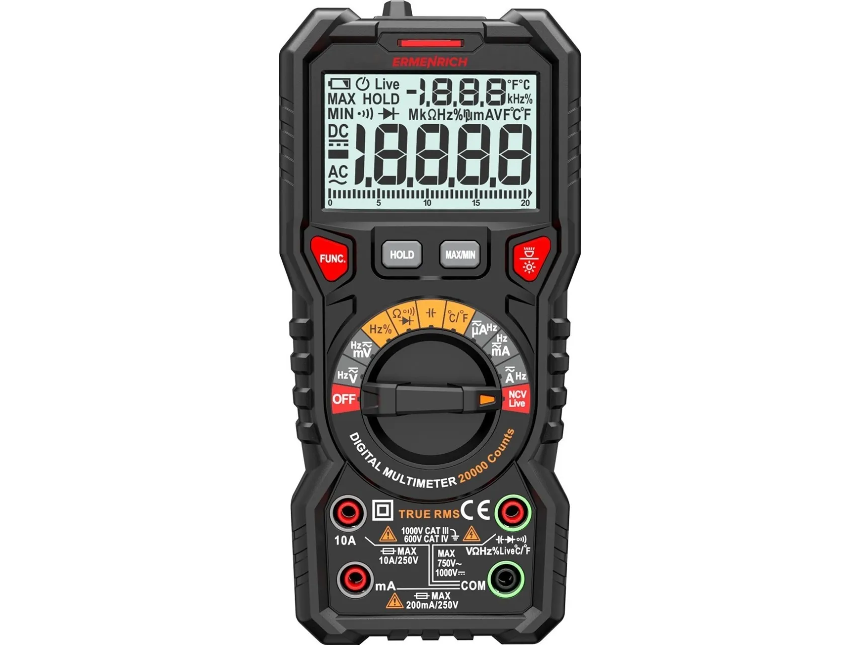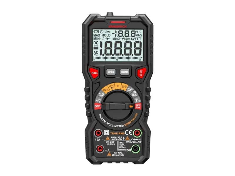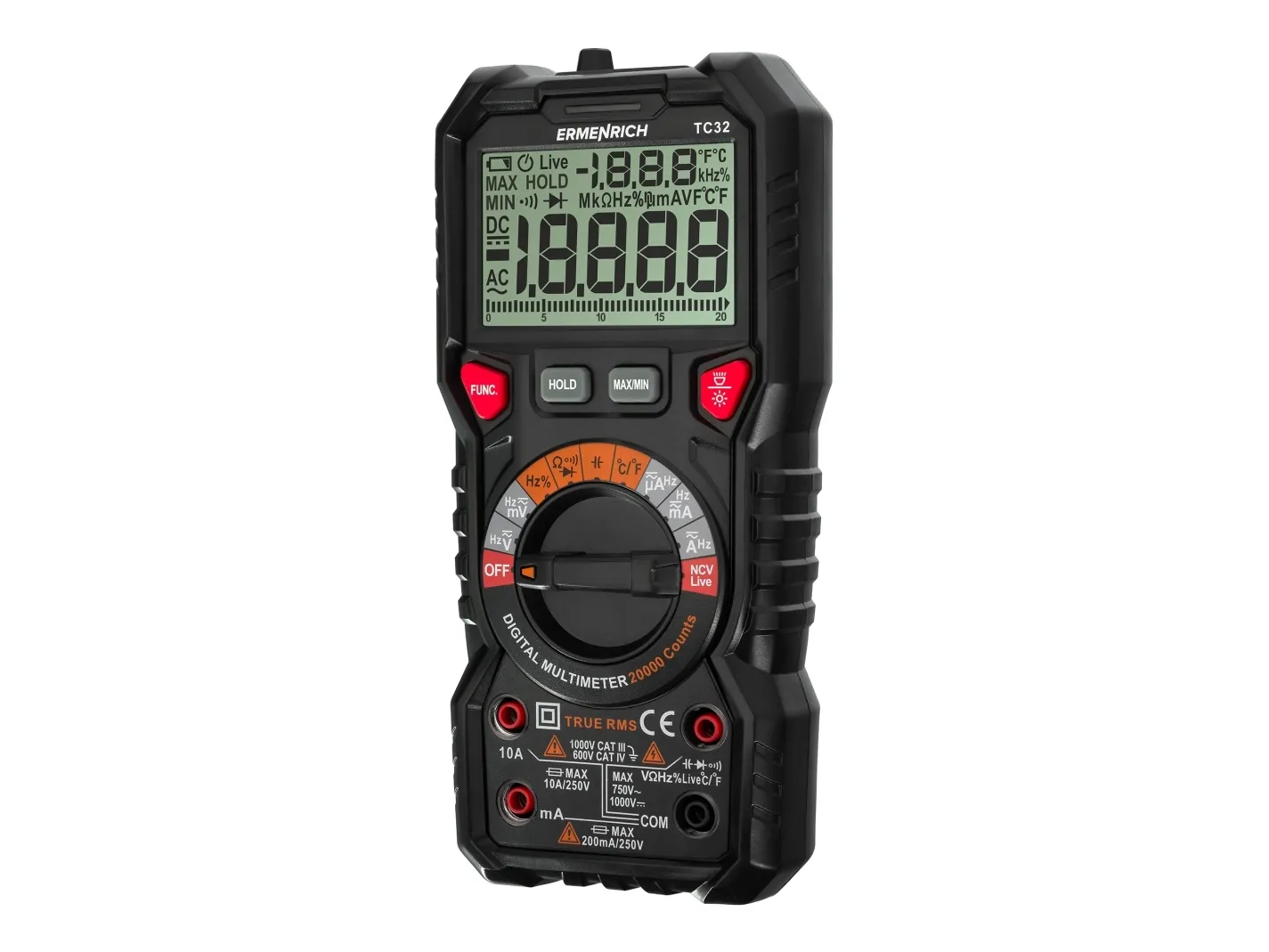 The Ermenrich Zing TC32 digital multimeter comes in handy in all situations where you need to measure amperage, voltage, and resistance as well as frequency, capacitance, and duty cycle. A thermocouple-based sensor measures the temperature. This multimeter is designed for checking the elements of electrical equipment, testing electrical equipment and devices as well as for the maintenance of electrical networks. The Ermenrich Zing TC32 can be used by professional users as well as beginners thanks to its wide functionality.