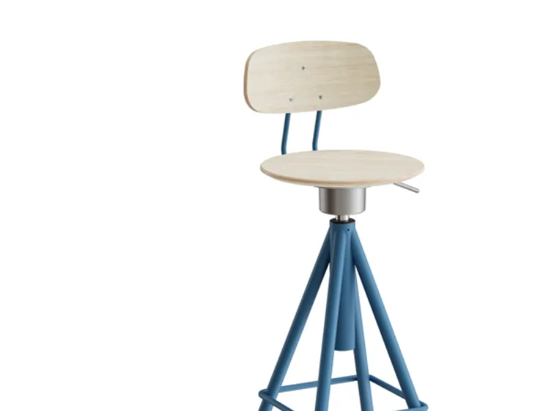 Taburet Atlas med ryg i lakeret stålstel og sæde belagt med højtrykslaminat i hvidpigmenteret eg. Hæve-sænkbar med gasregulering og vippefunktion for at få bedst mulig ergonomi. Passer godt til bordet i Atlas serien.