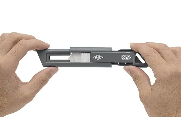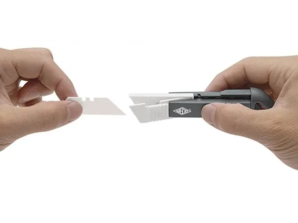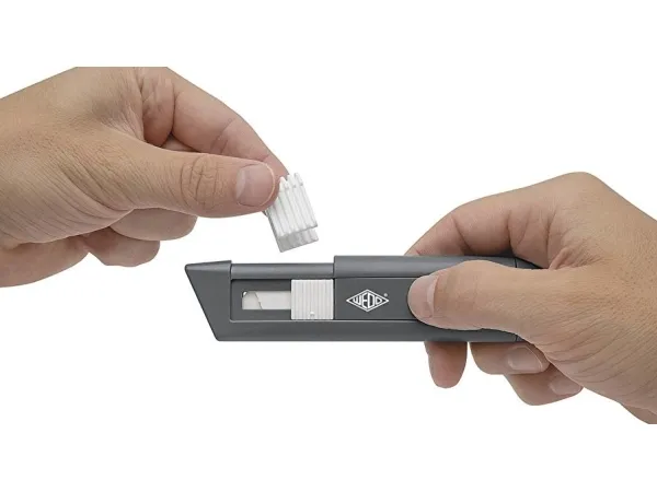 Sturdy plastic casing with ceramic blades. The spring-loaded trapezoid blade retracts immediately after the cut (do not hold the slide during cutting).The sturdy ABS plastic casing with suspension eye rests lightly and safely in the hand. By positioning the blade slider on top of the tool, the cutter can be used by both right and left-handers. Size approx.: 14.5 x 1.8 x 3.4 cm, weight approx.: 42 g, color: anthracite/white. TÜV/GS approved. Supplied on blister card. Ceramic blades: stay 10x longer sharp than steel; safer than metal blades; rust-free, no oil layer; acid-proof, chemically neutral; spark-free, nonconductive, non-magnetic.Wedo CERA-Safeline. Width: 18 mm, Length: 145 mm. Package type: Blister, Quantity per pack: 1 pc(s)