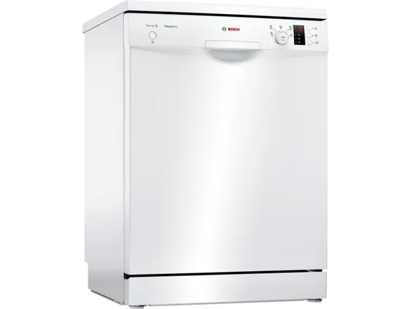 Bosch Serie 2 SMS25AW05E. Appliance placement: Freestanding, Product size: Full size (60 cm), Door colour: White. Number of place settings: 12 place settings, Noise emission class: C, Noise level: 48 dB. Energy efficiency class: E, Water consumption per cycle: 9.5 L, Energy consumption per 100 cycles: 92 kWh. Width: 600 mm, Height: 845 mm, Weight: 47 kg. Package weight: 48 kg