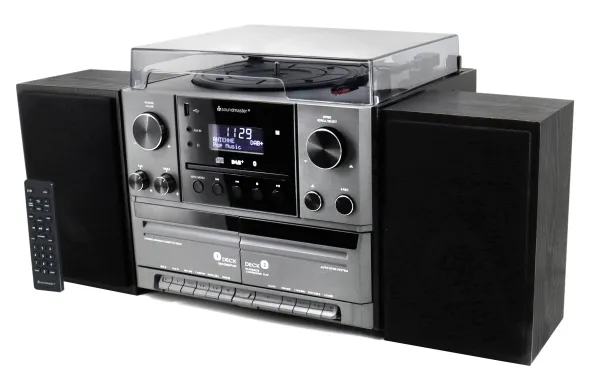 • DAB+/FM-RDS radio • CD, CD-R/RW, CD-MP3 • Turntable 33/45/78 RPM • USB-MP3 playback • Bluetooth® reception • Encoding - record on USB • Double cassette player with record function • 3.5 mm Aux In jack • 3.5 mm headphone jack • RCA (chinch) line out • Bass/treble control • 20 preset stations each • CD/USB repeat-/random-/program function • Remote control • Output power 2 x 5 W RMS • 75-ohm antenna jack • DAB+/FM antenna incl. • AC/DC adaptor 15 V/1.7 A incl.