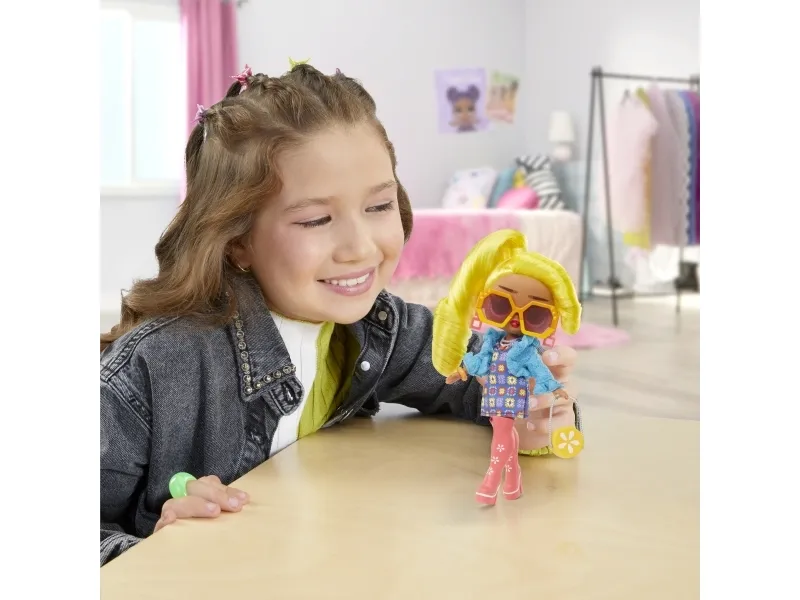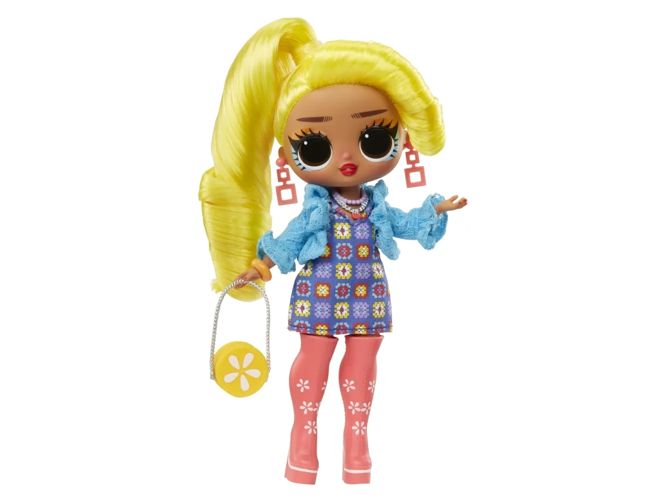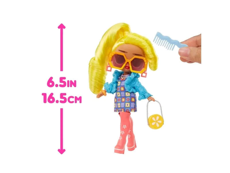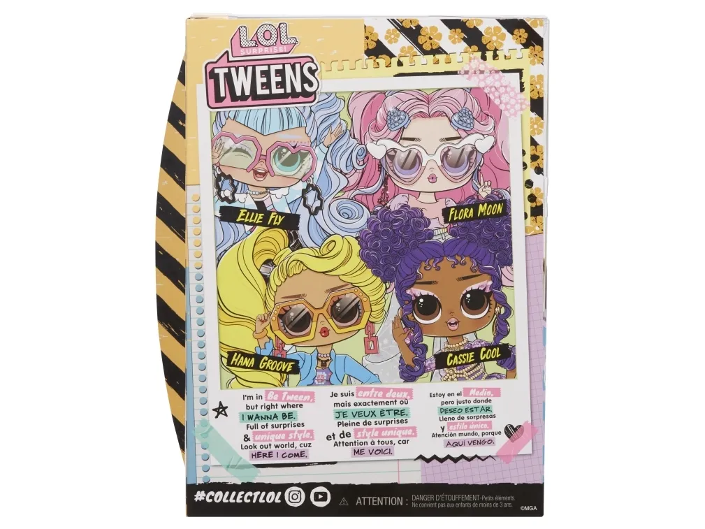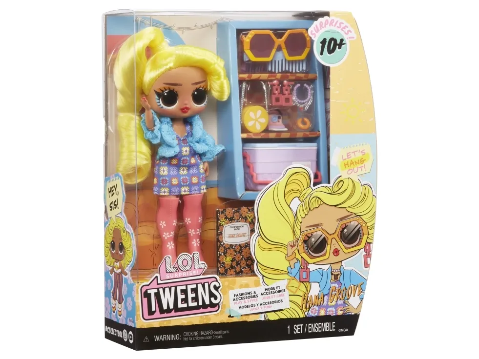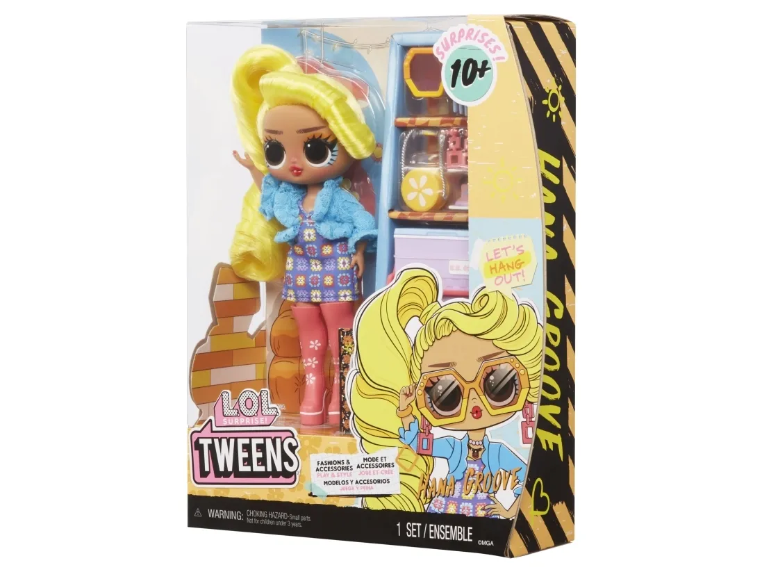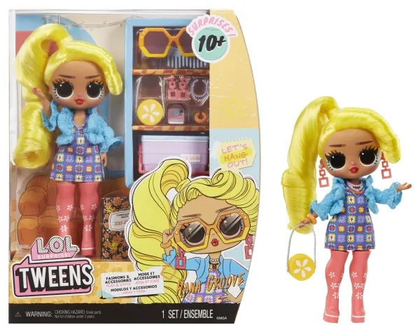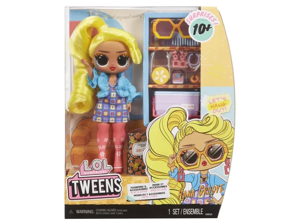 Introducing the all-new L.O.L. Surprise Tweens fashion doll Hana Groove, a fan of retro style and record stores! Unbox 10+ surprises and get to know Hana Groove who loves adding to her record collection and is always ready to groove. As the life of the party, she enjoys inviting her BFFs to hang out, especially on a sunny day! Dress Hana Groove in her beautiful fashions inspired by the 70s including her stylish crocheted dress and her pink knee-high boots that were made for walkin’. Her love for a sunshine-y day can be seen in her flower print purse and trendy sunglasses! Her outfit also includes a cropped jacket with frilly embellishments, square earrings, an adorable bracelet, and cool, layered necklaces! She also comes with a cute cooler that makes the best accessory to any picnic or dance party, along with an adorable polaroid camera ready to capture every moment. She has stunning features, beautiful hair, her own fabulous style, and comes articulated for tons of posing opportunities. Each box includes a L.O.L. Surprise Tweens fashion doll, unique fashions, boots, purse, sunglasses, accessories, cooler, camera, and hairbrush. Collect all L.O.L. Surprise Tweens fashion dolls: Ellie Fly, Hana Groove, Flora Moon, and Cassie Cool!