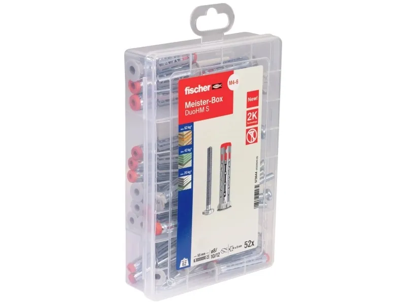 fischer mesterboks med hulrumsdyvel DuoHM, pandhead-skrue, TX-drev DuoHM kan hurtigt og nemt monteres ved hjælp af batteriskruemaskiner uden ekstra sætteværktøj. Dette reducerer monteringstiden med op til 50% i forhold til traditionelle dyvler. Den enestående 2-komponent-teknologi opfylder høje krav til last. Metalhylsteret presser sig til pladen og polyamid-grundkroppen sammen i byggematerialet. En pluglængde dækker alle almindelige byggematerialetykkelser på 9,5 - 30 mm for en fleksibel og omkostningseffektiv anvendelse. På grund af det metriske indvendige gevind kan skruen løsnes og skrues ind igen flere gange. Meddrejesikringen af polyamid sørger for en korrekt montering og forhindrer samtidig skader på byggematerilet. Fastgørelsen er ikke synlig bag monteringsdelen på grund af den smalle dyvelrand. Hulrumsdyvelen DuoHM dækker med kun én længde alle gængse materialetykkelser fra 9,5 - 30 mm. Med den nye og enestående kombination af polyamid og metal muliggør DuoHM høje belastninger og maksimal fleksibilitet i pladebyggestoffer. Metalhylsteret klapper bag byggematerialet og presser sig på bagsiden af pladen, plastikpdyvel spredes i pladen. DuoHM-montering sker hurtigt og nemt via batteridrevet skruemaskine uden ekstra sætteværktøj. Dette reducerer monteringstiden op til 50% i forhold til traditionelle pladedøvere. Takket være det metriske indvendige gevind kan monteringsdelen skrues ind og løsnes igen flere gange. Ud over den medfølgende skrue kan DuoHM også anvendes med andre metriske skruer. Meddrejesikringen af polyamid beskytter byggematerielets overflade mod beskadigelse. På grund af den smalle dyvelrand er dyvlen ikke længere synlig bag monteringsdelen.