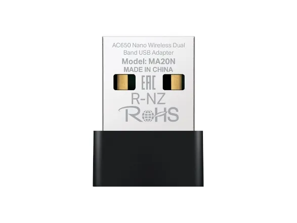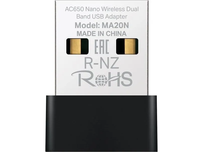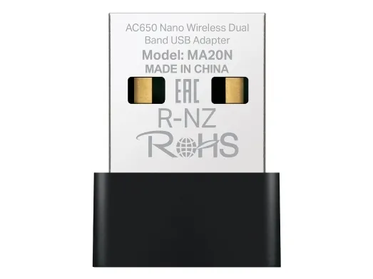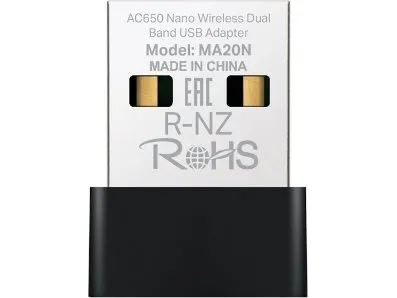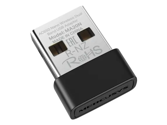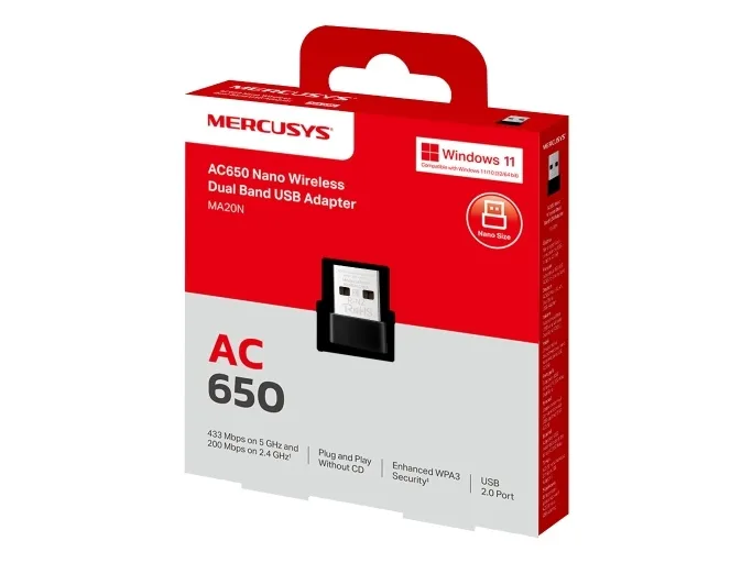 Compatible with Windows Operating System MA20N fully supports the latest Windows 11.Mercusys AC650 Nano Wireless Dual Band USB Adapter. Connectivity technology: Wireless, Host interface: USB Type-A, Interface: WLAN. Maximum data transfer rate: 650 Mbit/s, Top Wi-Fi standard: Wi-Fi 5 (802.11ac), Wi-Fi band: Dual-band (2.4 GHz / 5 GHz). Product colour: Black, Metallic