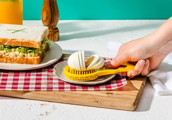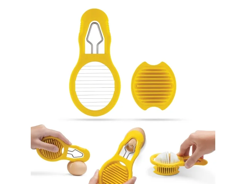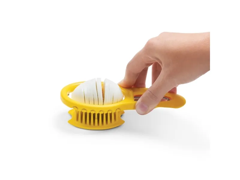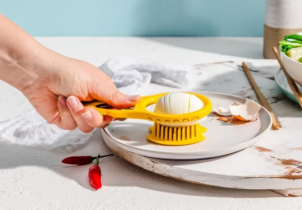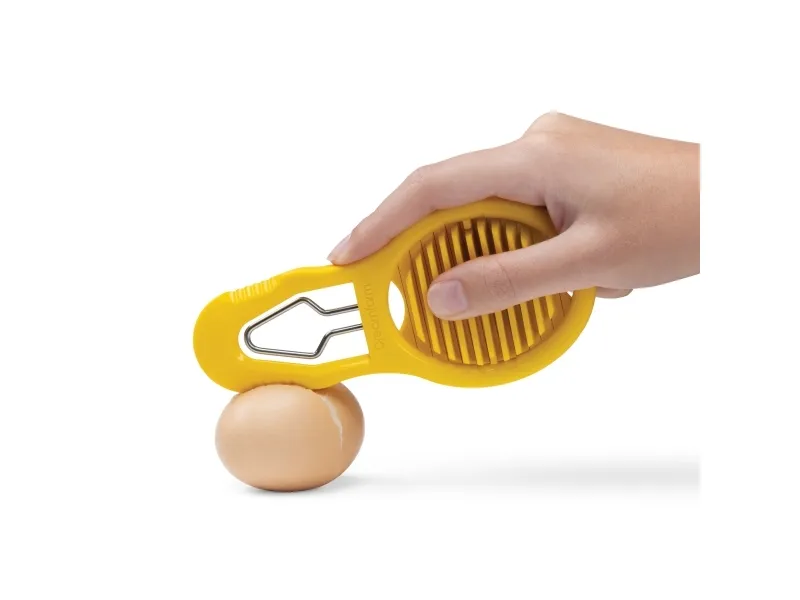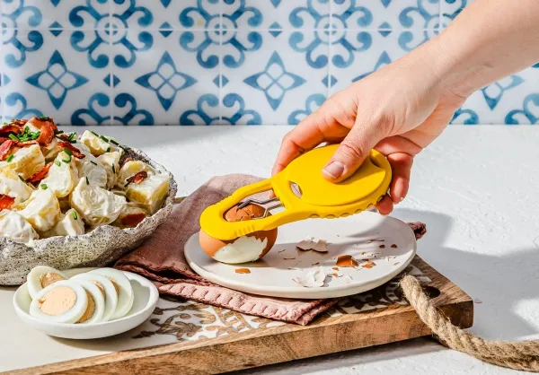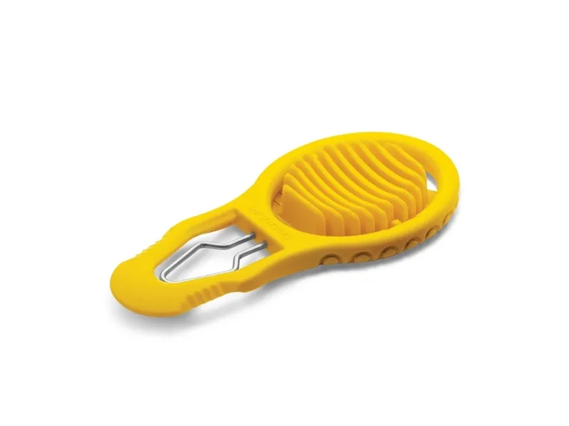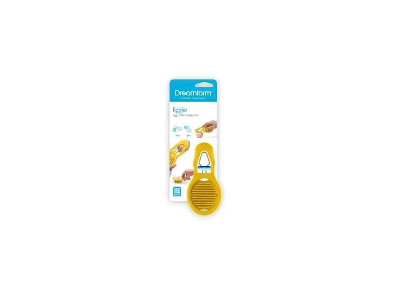 Eggler fra Dreamfarm er en æggedeler, der både kan knække, skrælle og skære hårdkogte æg i skiver. Et hurtigt tryk på Egglers riflede side skaber et rent brud i æggeskallen og et sted, hvor det spidse skrællehoved kan komme ind under æggeskallen. Egglers ydre form sørger for at holde skrællehovedet i rustfrit stål i den ideelle dybde, når den glider ind under æggeskallen for at adskille skallen fra ægget. Æggedeleren skaber nemt rene og jævne skiver til salater og sandwich. Leveres i et kompakt, slankt design og opbevares fladt i en skuffe. Materiale er polypropylene og rustfrit stål. BPA-fri. Tåler opvaskemaskine.