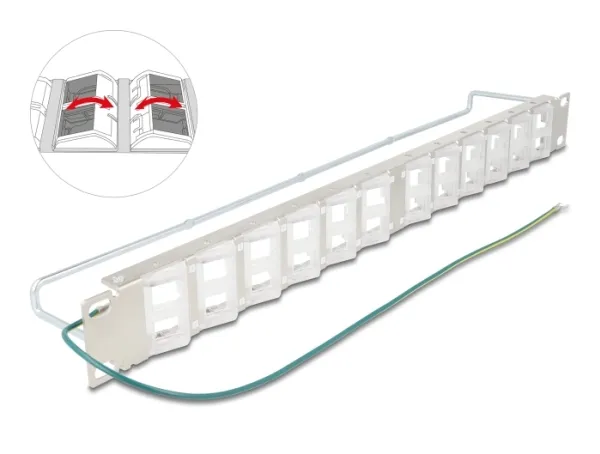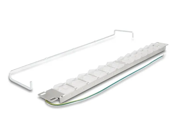 The Delock patch panel is designed for efficient cable management, featuring 24 ports that facilitate streamlined connections in a rack environment. Constructed from durable plastic and metal, this patch panel is built to withstand the rigors of regular use while maintaining high performance. The included items, such as labels, cable ties, and a grounding wire, enhance usability and organization, making it a practical choice for various installations. With tiltable ports and strain relief features, this patch panel allows for ease of cable insertion and minimizes stress on cables during operation. Its rack-mountable design fits 19-inch racks, ensuring compatibility with most setups. This patch panel is an essential component for creating tidy and professional network environments.
