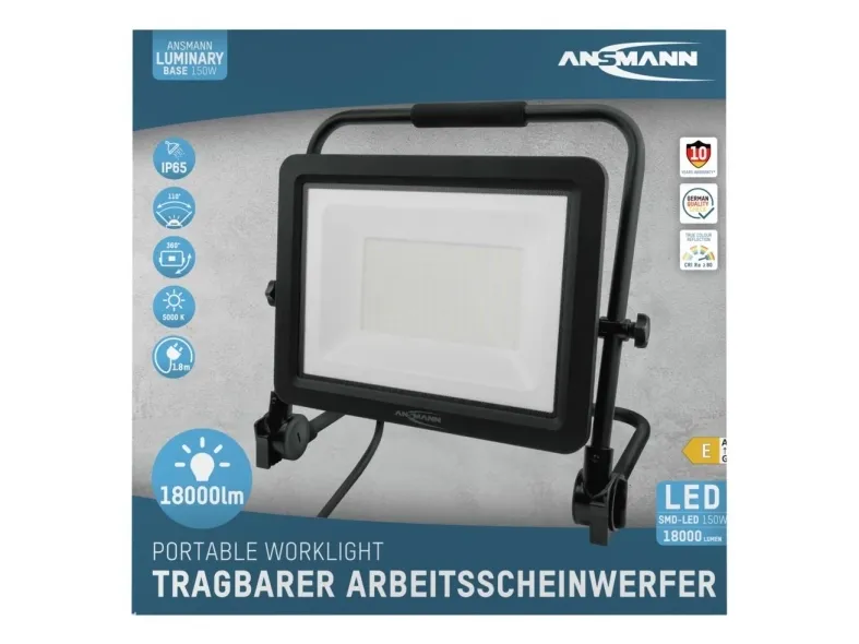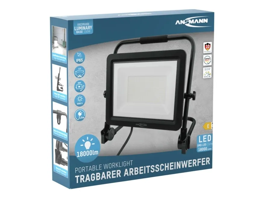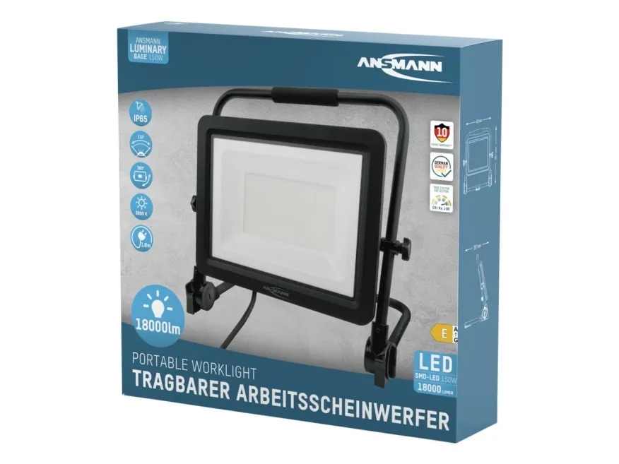 FL150W-AC er en professionel spot med SMD-LED-teknologi. Den pålidelige Ansmann Luminary lampe integreres uden besvær i den krævende hverdag, hvor du arbejder i og omkring huset, for eksempel på værksteder, byggepladser, industri, hus, have, gård eller garage. Ved brug af den højtydende SMD-LED-teknologi frembringer lampen et kraftigt lyst lys. Lampen kommer i den forbindelse op til 18.000 lumen. Grundet den brede udstrålingsvinkel bliver lyset jævnt fordelt, så selv de mindste detaljer samt store flader belyses. LED-lyset har en farvetemperatur på ca. 5000K, hvilket ikke belaster øjnene alt for meget. Resultatet bliver et behageligt og naturligt hvidt lys, der ikke gør øjnene trætte, hvorfor det bliver mere behageligt at udføre den pågældende arbejdsopgave. Det robuste og stødsikre kabinet er meget modstandsdygtigt over for mekanisk belastning. Takket være IP65 er lampen fuldstændigt beskyttet mod fremmedlegemer (støv), berøringer og vandstråler fra en hvilken som helst vinkel. På den måde kan du med optimal belysning indendørs og udendørs koncentrere dig fuldt ud om dit arbejde. FL150W-AC anvendes ved hjælp af det integrerede 180 cm lange kabel. H05RN-F gummikablet er fleksibelt og yderst egnet til anvendelse udendørs og på byggepladsen. På grund af sin beskaffenhed holder den mellemstore mekaniske belastninger og kan også anvendes på fugtige eller våde underlag. Uanset om du er mobil eller hjemme, med FL150W-AC har du altid den passende spot, der bringer lys i mørket! SMD-LED'erne skal bruge starttid på under 1 sekund for at levere den fulde effekt. Dermed leverer lampen den fulde effekt med det samme.