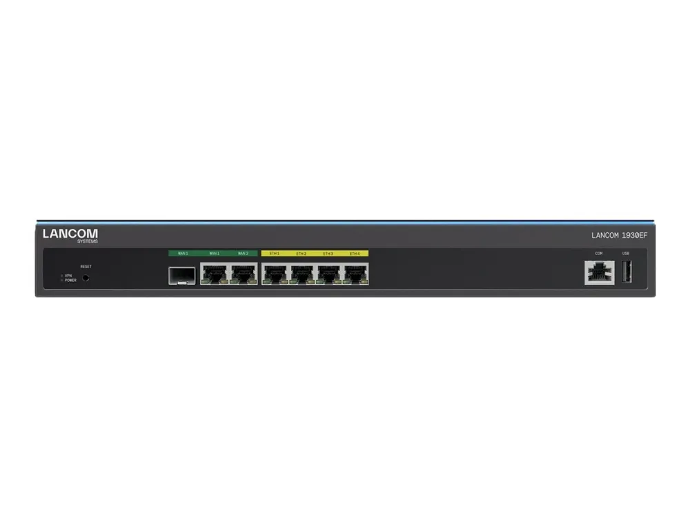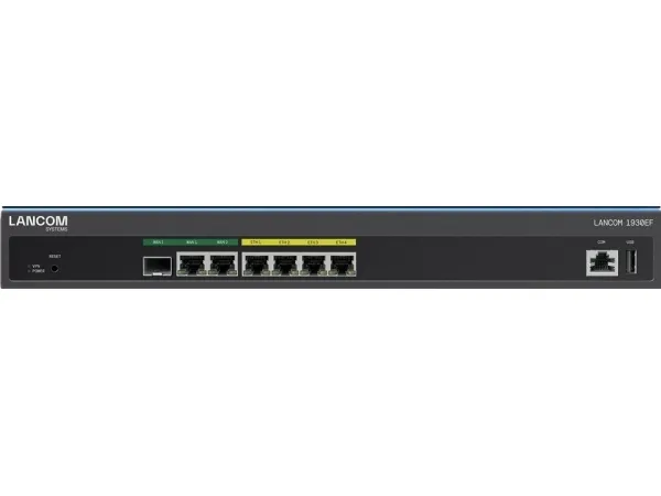 Multi-WAN SD-WAN gateway with fiber and Gigabit Ethernet As a multi-WAN SD-WAN gateway, the LANCOM 1930EF flexibly offers various Internet connections on one device for the site networking of medium-sized and large companies. Any external DSL or cable modems can be connected via Gigabit Ethernet. With the connection to fiber optic lines via an optional module, you also benefit from high-speed Internet even with data-intensive traffic. Intelligent load distribution across two Internet lines using load balancing increases the available bandwidth and reduces the network load. With the LANCOM Management Cloud (LMC), you centralize the management of the LANCOM 1930EF, ensure consistent and secure network management, and benefit from security "Engineered in Germany".
