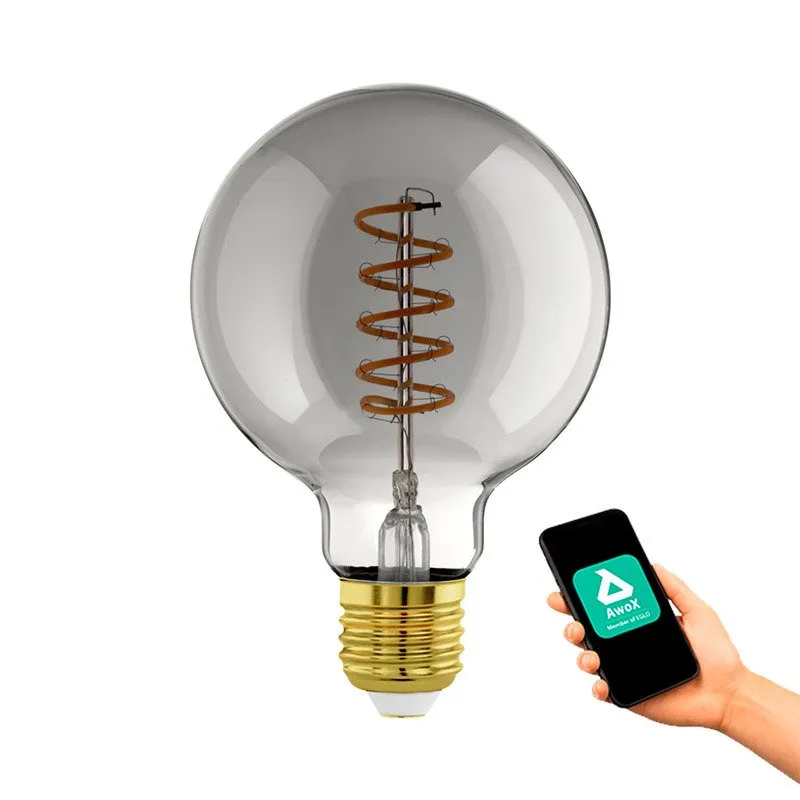 EGLO CONNECT-Z E27 LED G95 røgfarvet globe dekorationspære med spiral og varmt hvidt lys. Længde 14 cm, diameter 9,5 cm. E27, 4 watt, 150 lumen, 2000 kelvin. 80 CRI. Lyskilden kan dæmpes og styres med fjernbetjening (medfølger ikke), via AwoX Home Control app (gratis), eller ved stemmestyring. Zigbee er kompatibel med Amazon Alexa og Google Assistent.