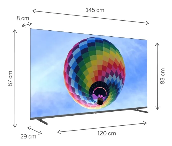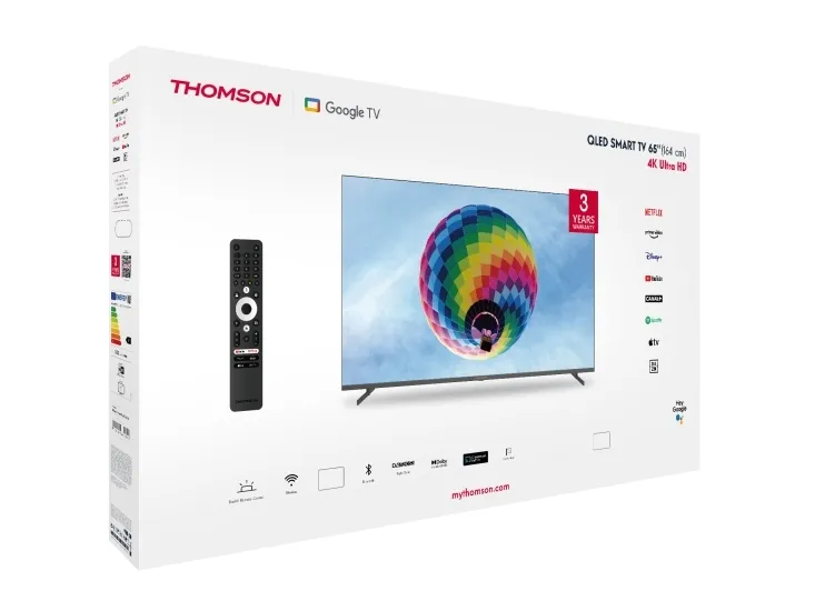 The Thomson 65QG5C14 LED-backlit LCD TV offers a captivating viewing experience, perfect for enjoying movies, shows, and gaming. With a resolution of 3840 x 2160 in 4K UHD, every detail is displayed with clarity. The 65-inch diagonal screen supports HDR formats such as HDR10 and Dolby Vision, delivering vibrant colors and deep contrasts. Featuring Quantum Dot technology, this TV enhances your visual experience further with color support up to 1 billion colors. Equipped with Google Assistant built-in and IoT compatibility, controlling this smart TV is seamless. Connectivity options include multiple HDMI ports, USB ports, and Bluetooth, allowing various devices to enhance entertainment. Additionally, the audio system with Dolby Atmos and a total output power of 20 watts ensures sound quality, creating a fully immersive experience. Enjoy Internet video playback and streaming services through an intuitive interface, making this TV a versatile addition to any home entertainment setup.