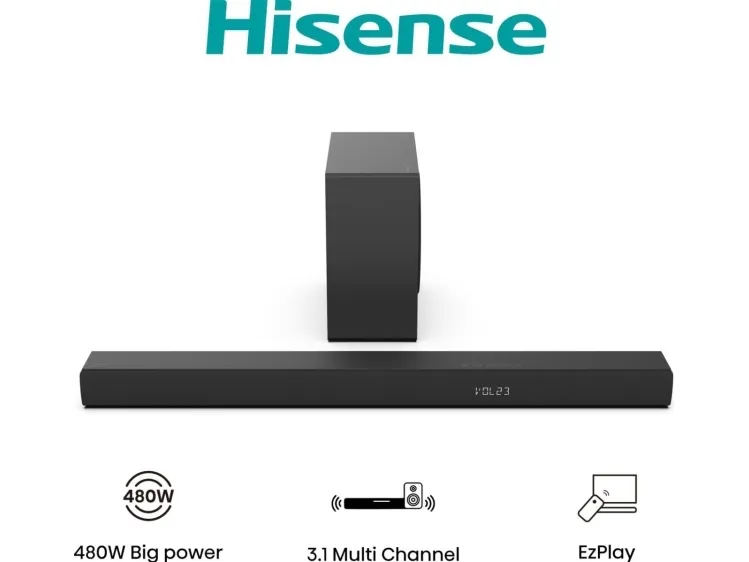 The Hisense HS3100 sound bar system is designed to elevate your home audio experience. Featuring 480 W of peak power, this 3.1-channel sound bar with an integrated subwoofer delivers rich sound that brings movies, music, and games to life. With support for high-definition audio formats such as FLAC, MP3, WAV, and WMA, along with built-in decoders for DTS Virtual:X and Dolby Digital Plus, the HS3100 ensures a high-fidelity audio experience that captures every detail.