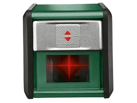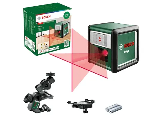 Krydslinjelaser Quigo Krydslinjelaser Quigo, magtplacering ganske enkelt korrekt, projicerer samtidig en horisontal og en vertikal laserlinje, laserlinjer er automatisk lige, selv når værktøjet står på en let ujævn overflade, enkel og intuitiv betjening takket være den enkelte skydekontakt, perfekt til hurtig indstilling af billeder, reoler, kantdøre, tapeter eller fliser, enkle, alsidige positioneringsmuligheder med universalklemme MM2 og adapterplade, holdbart konstrueret, yderligere oplysninger se nedenfor, 2 x batteri 1,5 V LR03 (AAA), universalklemme MM2 (0 603 692 201), hurtigmonteringsadapter, karton