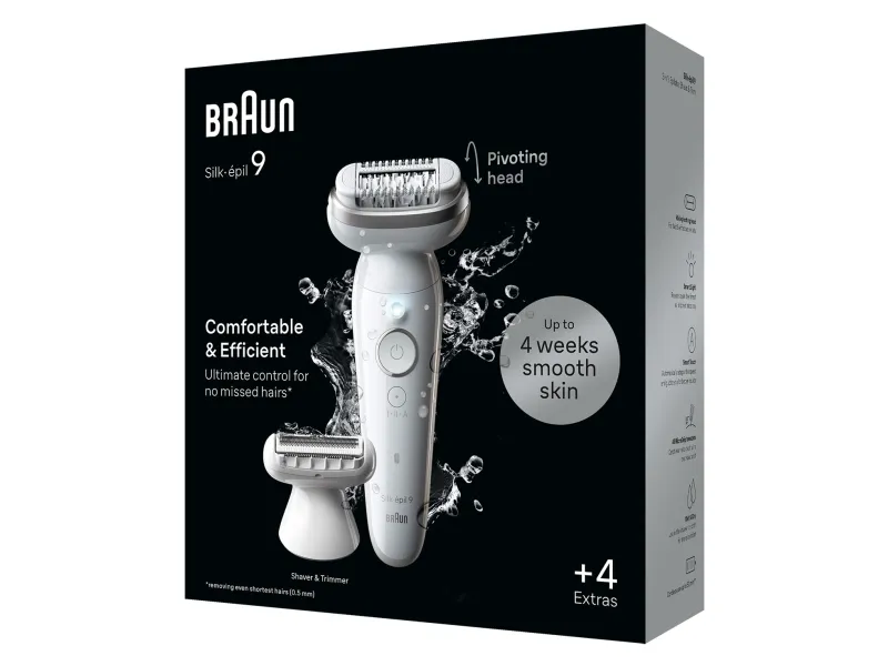 Braun Silk-épil 9 9-041. Product colour: Silver, Number of tweezers: 40 tweezers, Tweezers technology: MicroGrip. Power source: Battery, AC input voltage: 100 - 240 V, AC input frequency: 50/60 Hz. Width: 65 mm, Depth: 45 mm, Height: 163 mm