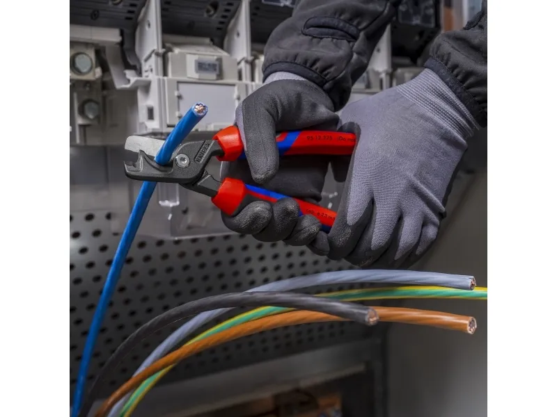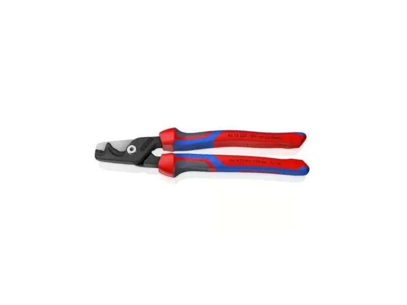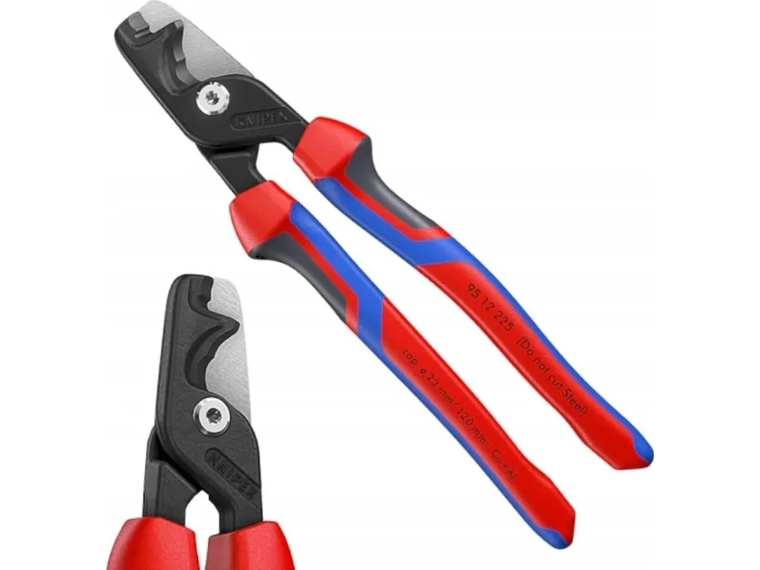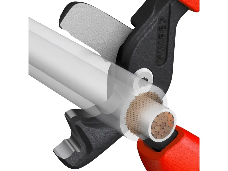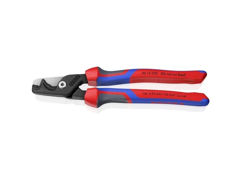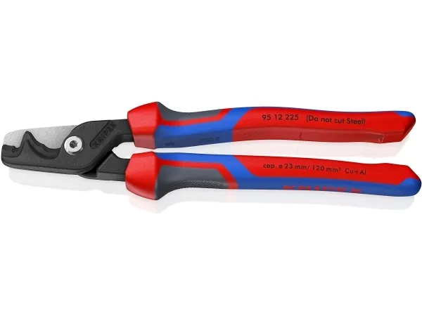 95 12 225 KNIPEX StepCut® XL Med kraftled, lange ben og optimerede skærekanter: mærkbart lettere klipning end med kompakte kabelsakse. Enorm kapacitet: Klipper massive kobber- eller aluminiumskabler op til 35 mm², flertrådede kabler op til 70 mm² og fleksible kabler op til 120 mm². To skæreområder: Trinvis skærekant for at holde tynde og mellemtykke kabler fast tæt på leddet, og forreste skærekant til gradvis klipning af meget tykke kabler. Praktisk en- og tohåndsbetjening selv med store kabeldiametre takket være minimeret benbredde. Skruet kraftled: Stor udveksling, letgående, justerbar. Slankt hoved for bedre tilgængelighed. Klemmebeskyttelse for sikkert arbejde. Ikke egnet til stålforstærkede kabler som ACSR. Skærekanterne er desuden laserhærdede, skærekanternes hårdhed er ca. 56 HRC. Med komfort-håndtag: fremstillet af tre ergonomiske komponenter til optimeret håndtering og med to KNIPEXtend-grænseflader til forlængelser.