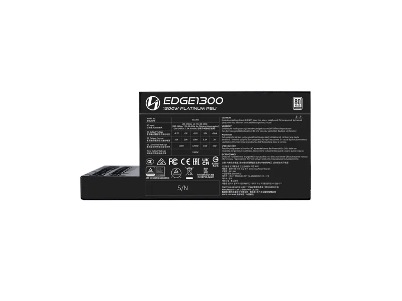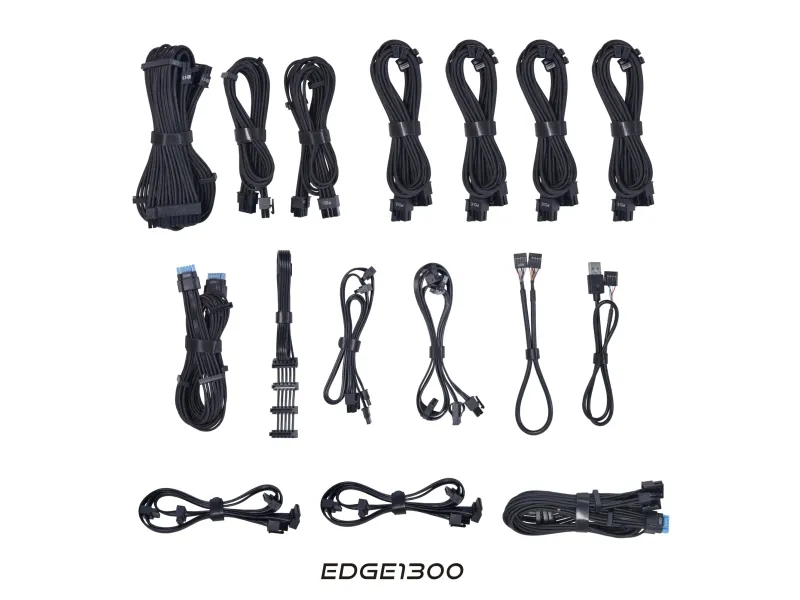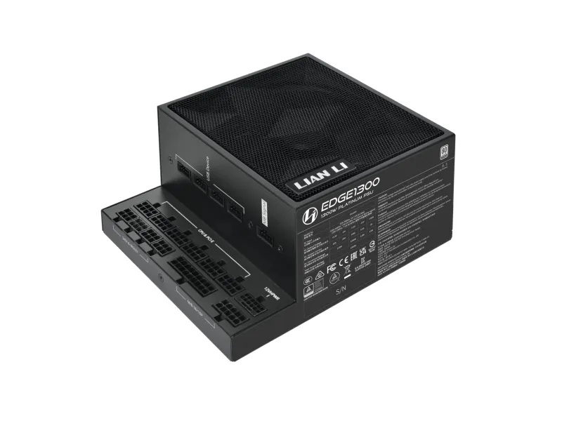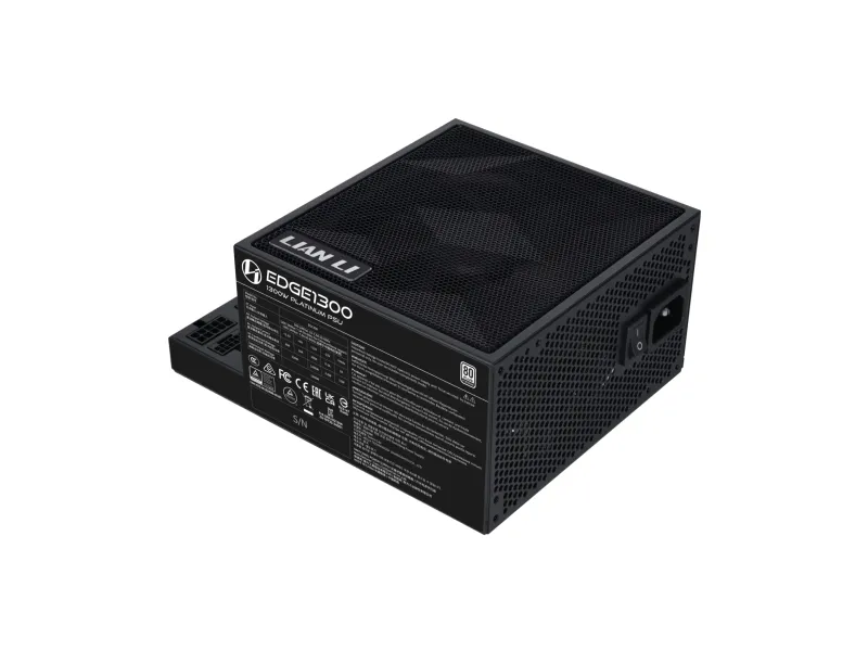 Lian Li EG1300. Total power: 1300 W, AC input voltage: 100 - 240 V, Combined power (+3.3V): 100 W. Motherboard power connector: 20-pin ATX, Motherboard power cable length: 30 cm, SATA power cable length: 120 mm. Purpose: PC, Power supply unit (PSU) form factor: SFX, 80 PLUS certification: 80 PLUS Gold. Product colour: Black. Cables included: CPU, PCIe, Peripheral (Molex), SATA