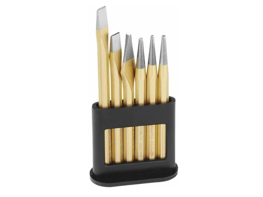 Mejsel- og gennemslager-sæt i plastholder Dette praktiske værktøjssæt består af to fladmejsler, en krydsmejsel, et korn og to drivere i forskellig diameter. Alle værktøjer er egnede til metalområdet.