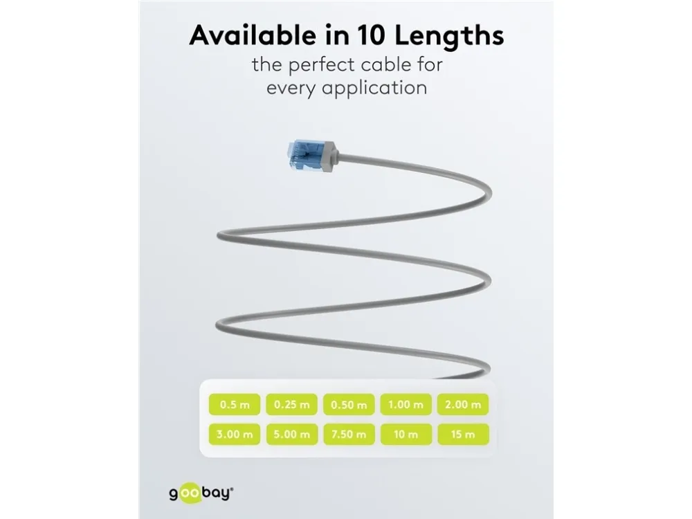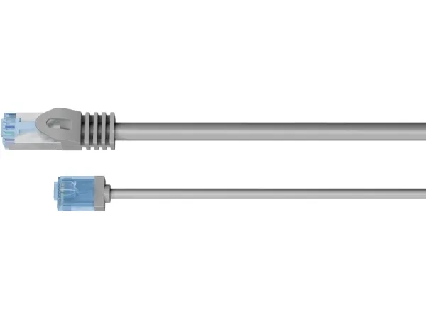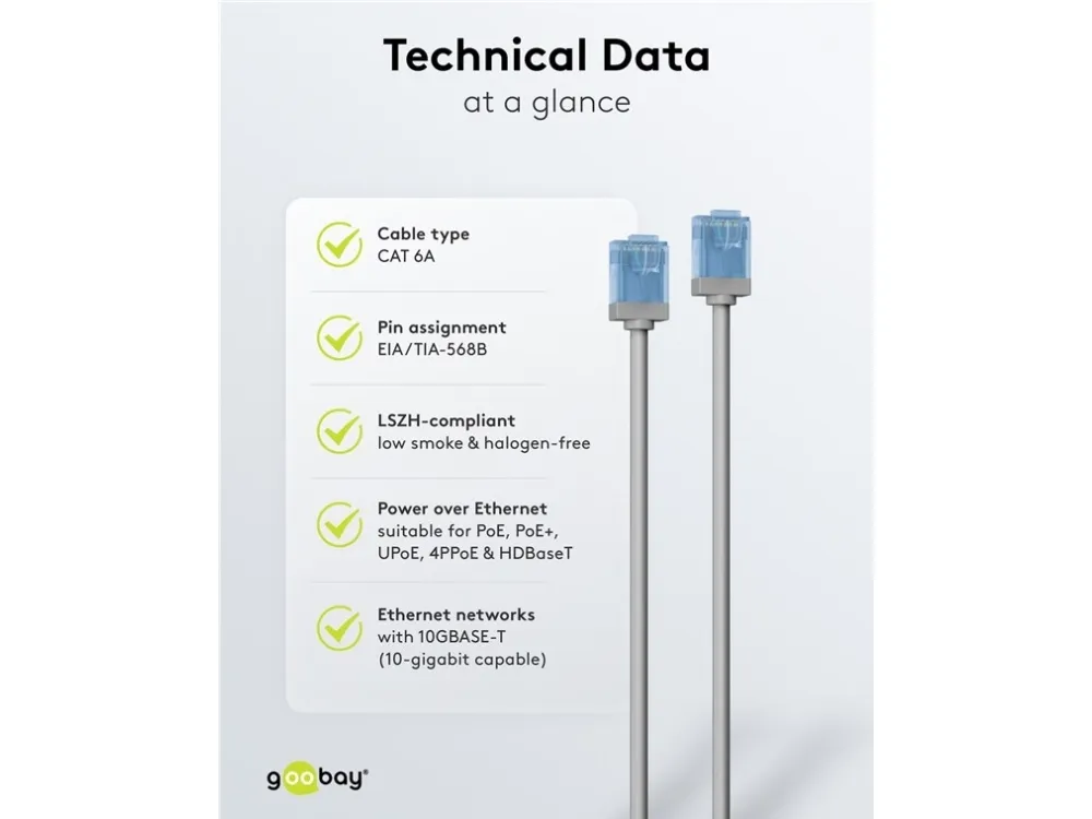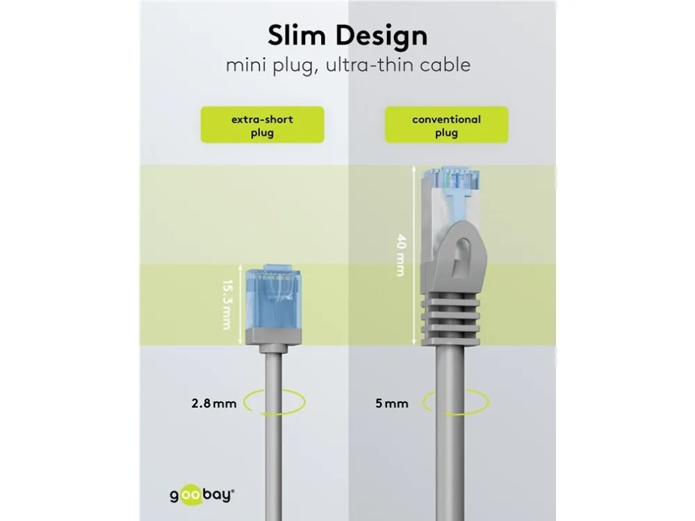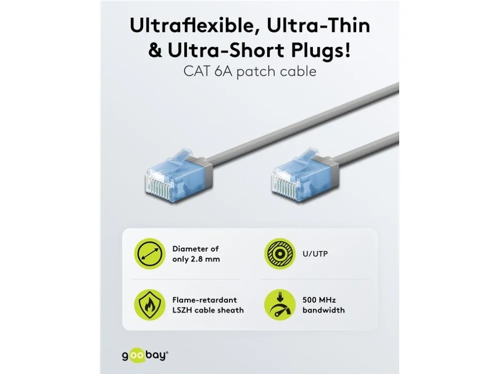 ekstrakorte stik, ren kobberleder (CU), LSZH, TPE-kappe, AWG 32 Kabellængde Supertyndt LAN-kabel med ekstrakorte RJ45-stik (15.3mm) for mindre kabelvolumen i serverskabet eller patchpanelet og dermed optimeret luftcirkulation Sikkert og fleksibelt: Uskærmet og med en røgsvag, halogenfri TPE-kappe for en særlig lille bøjningsradius og høj fleksibilitet Takket være AWG 32 og en ydre diameter på 2,8 mm er kablet ultratyndt, men lige så kraftigt som et standard CAT-kabel Som CAT 6A netværkskabel er det perfekt til hurtige forbindelser som 10 Gigabit Ethernet 10GBASE-T, 100BASE-TX, 1000BASE-T og 10/100/1000/10000 Mbit/s RJ45-kablet er egnet til Power over Ethernet (PoE) Kobberleder (CU) af høj kvalitet og guldbelagte stikforbindelser sikrer lav transmissionsmodstand og forhindrer korrosion Den effektive, kompakte knækbeskyttelse er stærk mod kabelbrud og sikrer en lang levetid for Ethernet-kablet