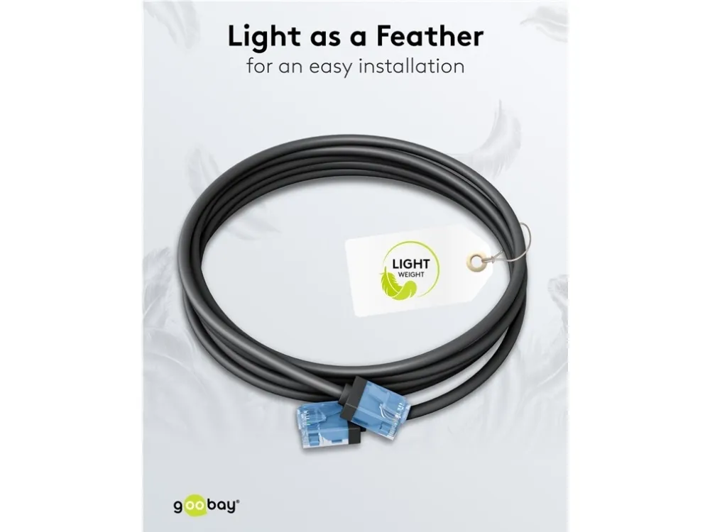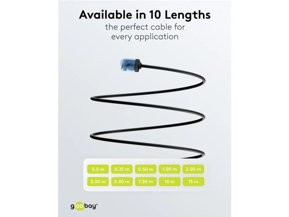 ekstrakorte stik, ren kobberleder (CU), LSZH, TPE-kappe, AWG 32 Kabellængde Supertyndt LAN-kabel med ekstrakorte RJ45-stik (15.3mm) for mindre kabelvolumen i serverskabet eller patchpanelet og dermed optimeret luftcirkulation Sikkert og fleksibelt: Uskærmet og med en røgsvag, halogenfri TPE-kappe for en særlig lille bøjningsradius og høj fleksibilitet Takket være AWG 32 og en ydre diameter på 2,8 mm er kablet ultratyndt, men lige så kraftigt som et standard CAT-kabel Som CAT 6A netværkskabel er det perfekt til hurtige forbindelser som 10 Gigabit Ethernet 10GBASE-T, 100BASE-TX, 1000BASE-T og 10/100/1000/10000 Mbit/s RJ45-kablet er egnet til Power over Ethernet (PoE) Kobberleder (CU) af høj kvalitet og guldbelagte stikforbindelser sikrer lav transmissionsmodstand og forhindrer korrosion Den effektive, kompakte knækbeskyttelse er stærk mod kabelbrud og sikrer en lang levetid for Ethernet-kablet