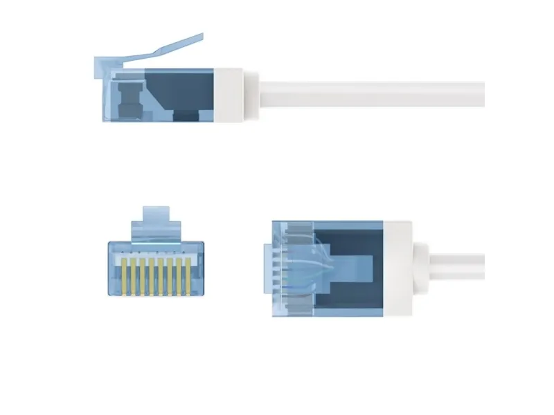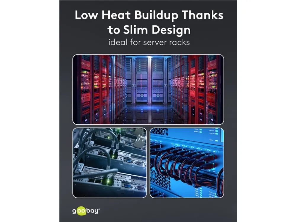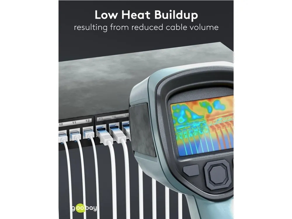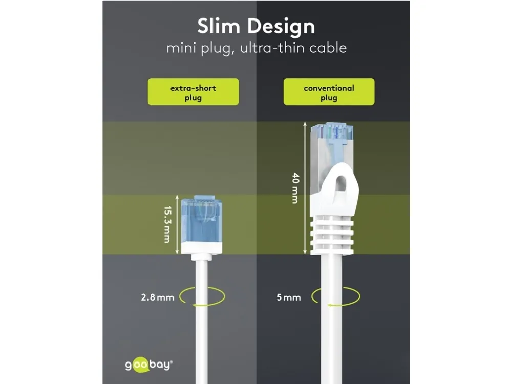 Supertyndt LAN-kabel med ekstrakorte RJ45-stik (15.3mm) for mindre kabelvolumen i serverskabet eller patchpanelet og dermed optimeret luftcirkulation