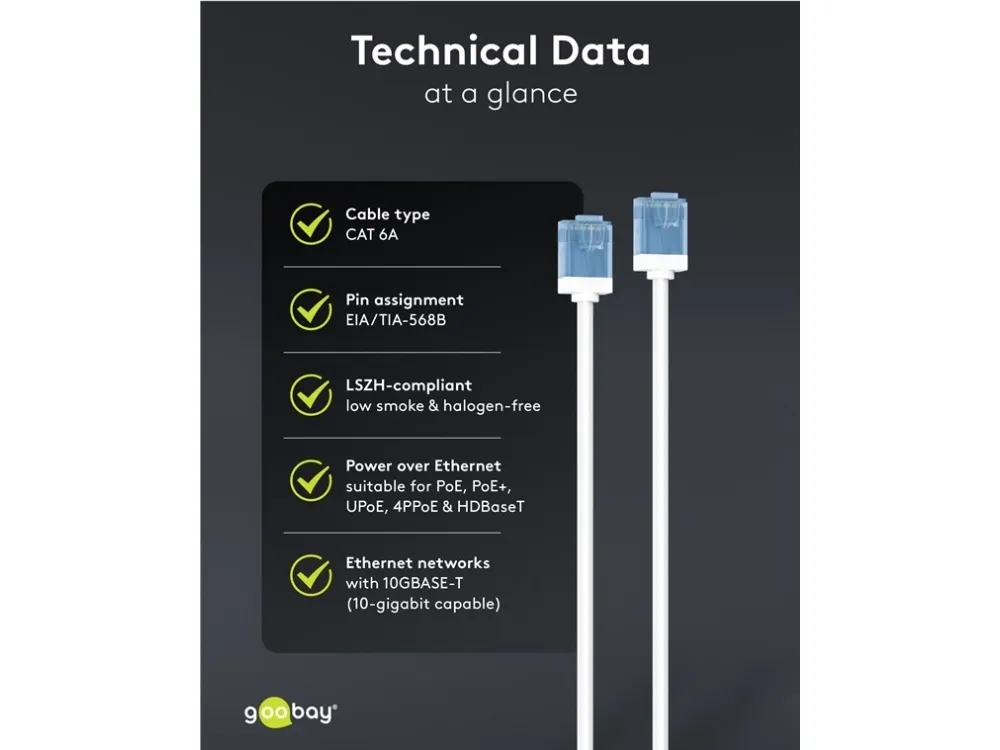 Som CAT 6A netværkskabel er det perfekt til hurtige forbindelser som 10 Gigabit Ethernet 10GBASE-T, 100BASE-TX, 1000BASE-T og 10/100/1000/10000 Mbit/s