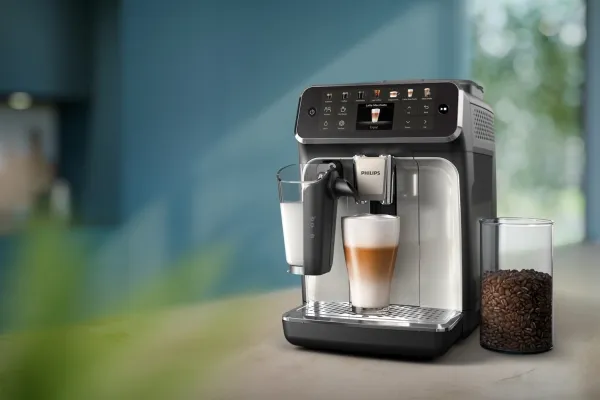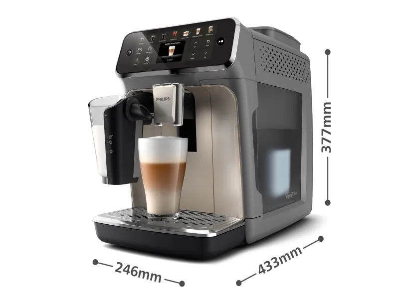 The Philips Series 4400 EP4446 automatic coffee machine is designed to elevate the coffee brewing experience. With a powerful 15 bar pressure, it brews a variety of beverages, including espresso, latte macchiato, and iced coffee, ensuring satisfying taste and quality. The integrated coffee grinder allows users to prepare fresh coffee from either ground coffee or coffee beans, making it versatile for any preference. Enjoy customizable coffee strength and length with adjustable settings, while the 1.8 liter water tank and 275 g coffee bean capacity accommodate multiple servings with ease. Cleaning and maintenance are hassle-free, as both the drip tray and LatteGo lid are dishwasher safe. The digital TFT display simplifies operation, featuring programmable settings and temperature controls for an easy brewing process. Included accessories like the AquaClean filter cartridge and measuring spoon further enhance the convenience offered by this coffee machine, making it a reliable companion for coffee enthusiasts.