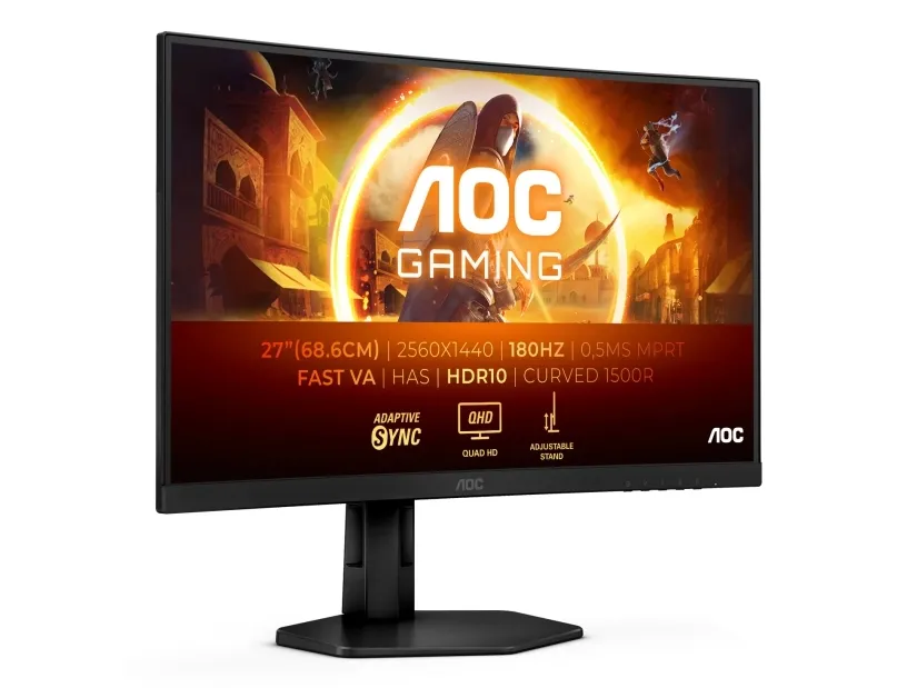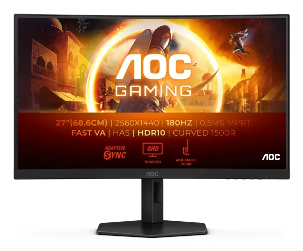 Restart your gaming session with this miracle 27-inch curved monitor, CQ27G4X Experience unparalleled gaming immersion with AOC 27" QHD curved monitor, boasting a crystal-clear 2560x1440 resolution and an ultra-smooth 180Hz refresh rate and 0,5ms response time MPRT. With 1500R curvature and a fast VA panel with up to 1ms GtG and HDR10 support, this monitor delivers stunning visuals and vibrant colors. For your customization, a height-adjustable eSports base is waiting for your extended gaming sessions and G-Menu will be your ultimate customized tool for dominating the competition.AOC G4 CQ27G4X. Display diagonal: 68.6 cm (27"), Display resolution: 2560 x 1440 pixels, HD type: Quad HD, Display technology: LCD, Response time: 1 ms, Native aspect ratio: 16:9, Viewing angle, horizontal: 178°, Viewing angle, vertical: 178°. VESA mounting, Height adjustment. Product colour: Black