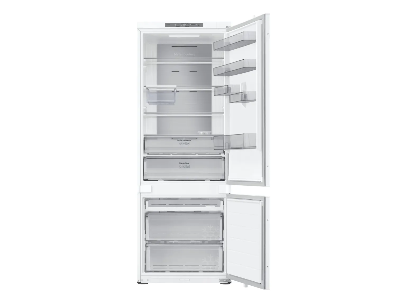 Samsung BRB38G705DWW. Total net capacity: 389 L. Door hinge: Right. Climate class: SN-T, Noise level: 35 dB. Fridge net capacity: 289 L, No Frost (fridge), Fridge interior light, Fridge number of shelves/baskets: 4, Number of vegetable drawers: 2. Freezer net capacity: 100 L, No Frost (freezer). Fresh zone compartment. Energy efficiency class: D, Annual energy consumption: 206 kWh. Product colour: White