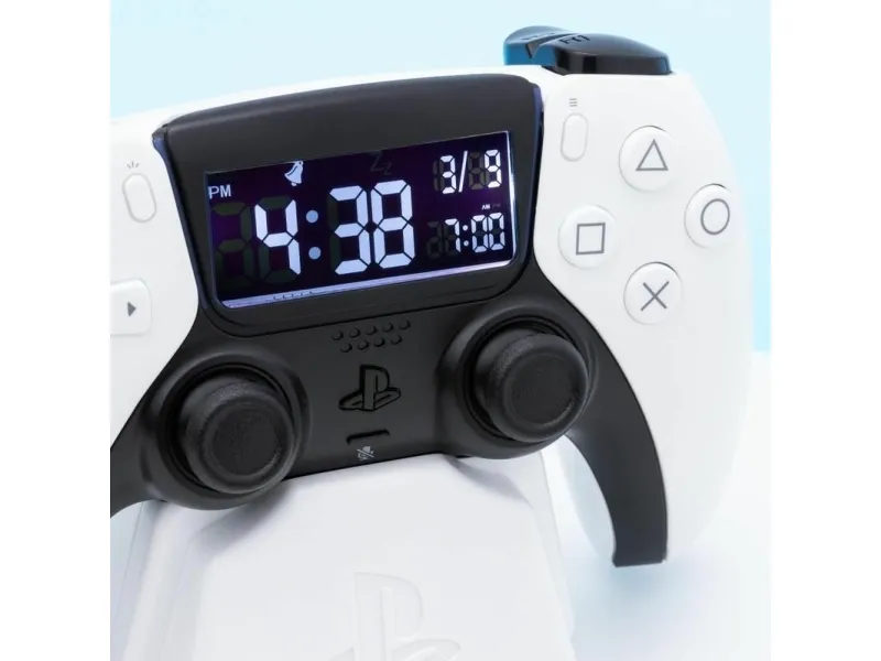 The 15.8cm (6.2") wide white alarm clock is designed to resemble the PlayStation 5 DualSense controller. It includes an LCD digital display screen. Use the D-pad and controller buttons to set the time, date and alarm, and to activate the snooze function.