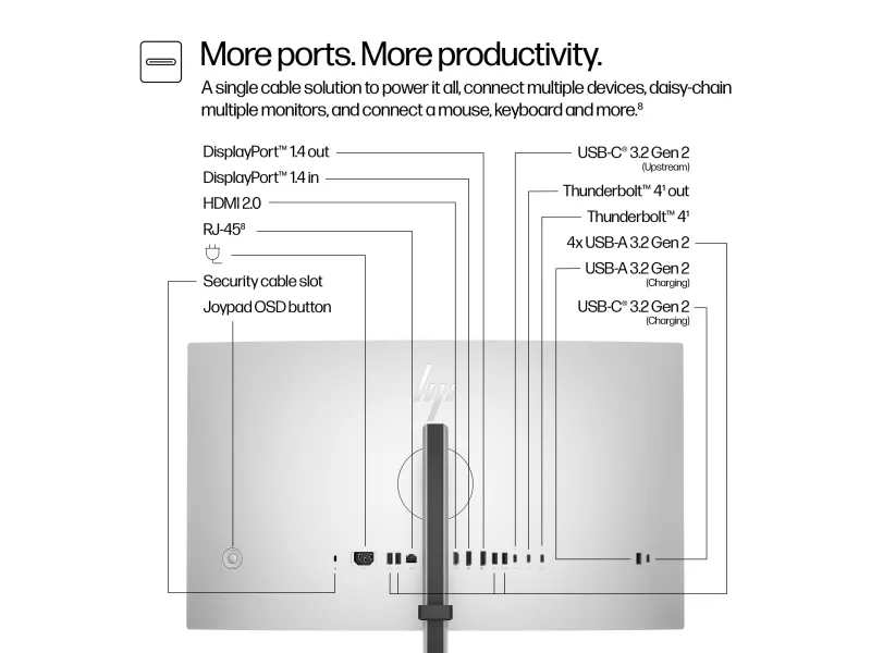 Tilkoblingsmulighetene er enkle takket være Thunderbolt 4-, HDMI- og DisplayPort-innganger, sammen med en innebygd USB 3.2 Gen 2-hub som støtter strømtilførsel på opptil 100 W. Enten du er en kreativ profesjonell, en multitasker eller trenger en effektiv arbeidsplass, vil denne skjermens omfattende tilkoblingsmuligheter og innebygde enheter som KVM-bryter og Ethernet-port gjøre den til hjertet i oppsettet ditt. Den ergonomiske designen, med justeringsmuligheter for høyde, pivot, sving og tilt, sammen med HP Eye Ease og Flicker-Free-teknologi, sørger for komfort under lange arbeidsøkter. Løft arbeidsområdet ditt med HP 727pm Series 7 Pro-skjermen, der funksjonalitet møter eksepsjonell visuell kvalitet.