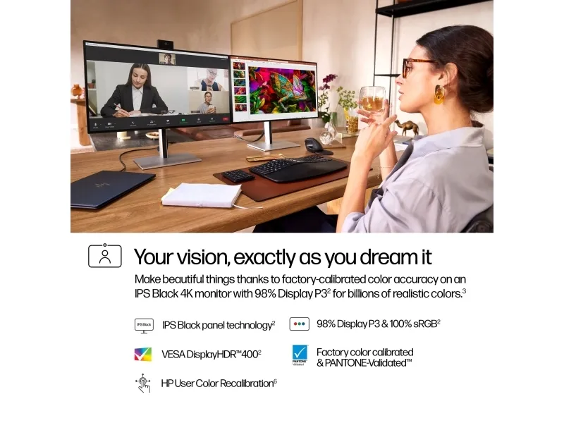 Oppdag HP 727pm Series 7 Pro-skjermen, designet for profesjonelle som nekter å gå på kompromiss med kvalitet og effektivitet. Denne 27-tommers skjermen har en 4K IPS Black-skjerm som gir liv til det visuelle med over 1 milliard farger, støttet av 100 % sRGB- og 98 % DisplayP3-fargeskalaer for nøyaktig fargegjengivelse. Med et dynamisk kontrastforhold på 10 000 000:1 og HDR400-sertifisering leverer den dype svarte farger og levende farger, slik at alle detaljer står skarpt og tydelig.