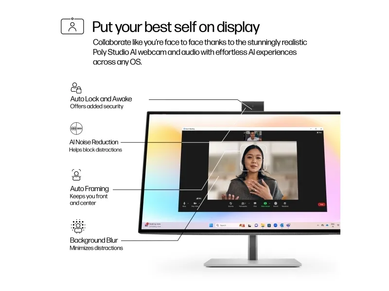 Windows Hello-kompatibel, IR-sensor, sprettoppvern, HDR, 95.6° diagonal field of view (dFoV), auto framing, background blur, auto lock and awake