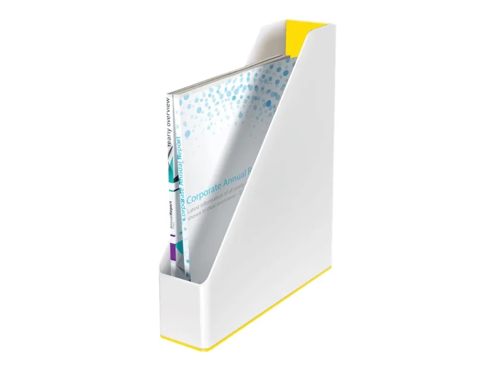 Iøynefallende, premium kvalitets tidsskriftsamler i flotte, metalliske farger med glanset finish. Denne robuste tidsskriftsamleren passer perfekt sammen med de andre Leitz WOW-produktene.