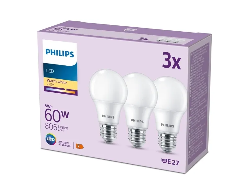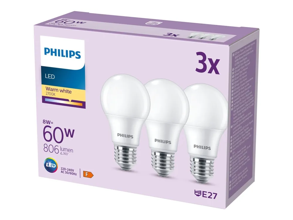 Philips - LED-lyspære - form: A60 - mattslipt finish - E27 - 8 W - varmt hvitt lys - 2700 K (en pakke 3)