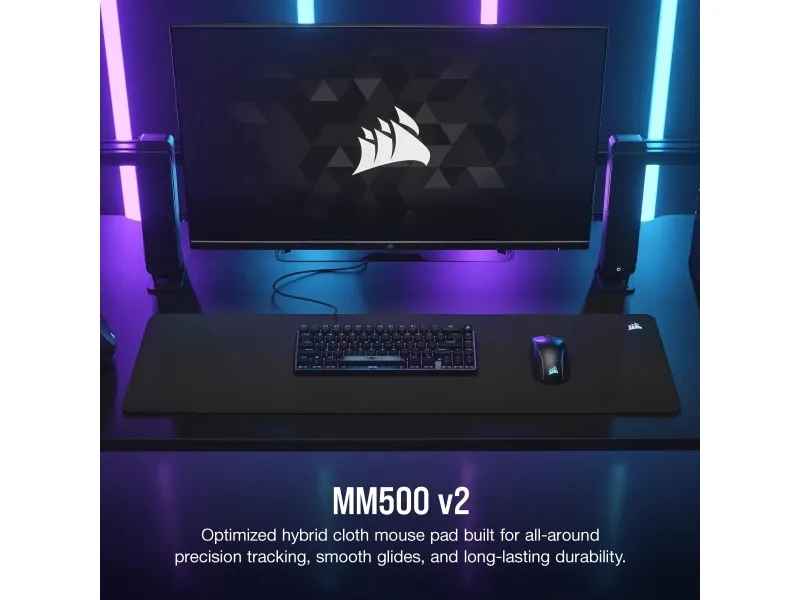 The CORSAIR MM500 v2 mouse pad is designed to enhance the gaming experience with its construction and reliable features. Made from hybrid cloth, this mouse pad offers a smooth surface for optimal mouse movement while ensuring durability thanks to the anti-fraying stitched edges. The splash-proof surface helps to maintain cleanliness and protects against spills, allowing users to focus on their gaming without distractions. Additionally, the non-slip base ensures that the mouse pad remains securely in place during intense gaming sessions.
