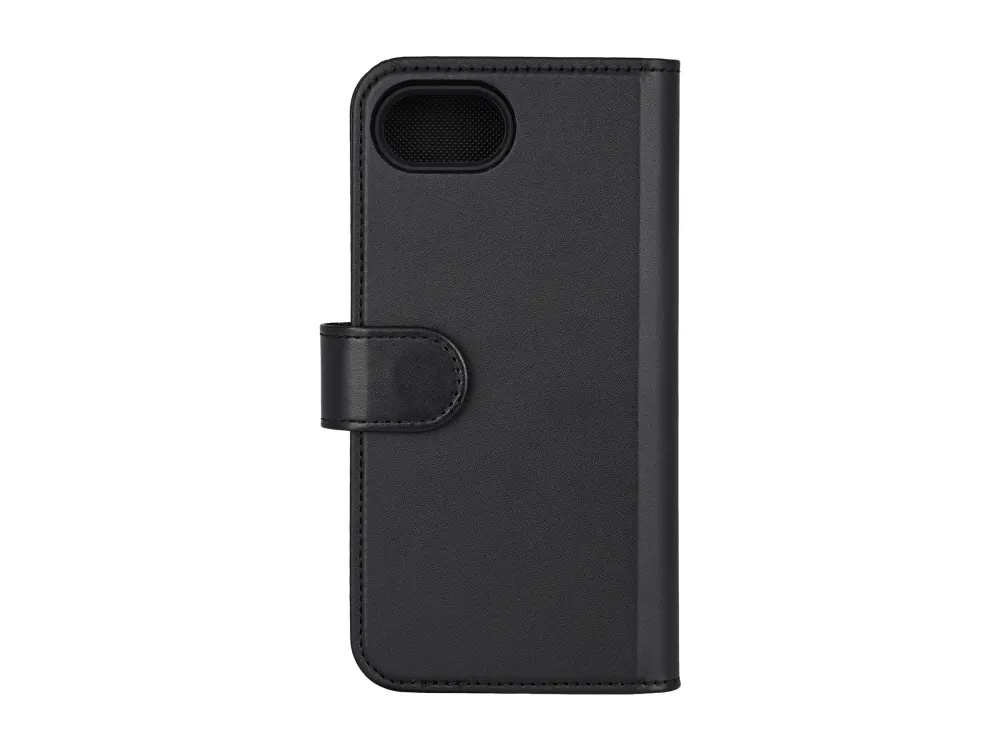 Stylish wallet case for iPhone in high-quality vegan leather. The case has three credit card slots and a pocket for bills. The locking tab on the case uses a magnetic closure. Inside the case is a removable magnet cover that can be attached to other magnetic surfaces and it compatible with Apple's magnetic solution.