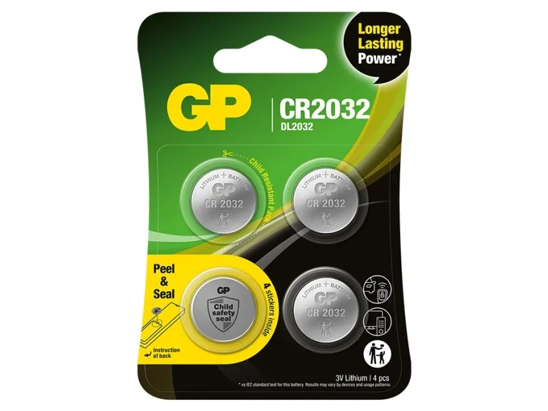 GP CR2032 knapcelle batteri - 4 stk. GP's højtydende lithium-møntbatterier CR2032 er energitætte og kan levere op til 30 % mere strøm til dine miniature-specialenheder, herunder bilnøgler, fjernbetjeninger, smartwatches, blodsukkermålere, smart home-enheder, IoT-enheder samt dør- og vinduessensorer. Med fremragende energibesparende egenskaber og en holdbarhed på op til 10 år, når de opbevares korrekt på et køligt og tørt sted, undgår du flade batterier. Batterierne er designet til at fungere pålideligt under ekstreme forhold og kan klare temperaturer fra -20 °C til +60 °C. Sikkerheden kommer først – disse batterier er ikke kun udviklet til at beskytte dine enheder med en lækagesikker konstruktion, men også til at beskytte dine kære med en gennemtænkt børnesikret emballage.