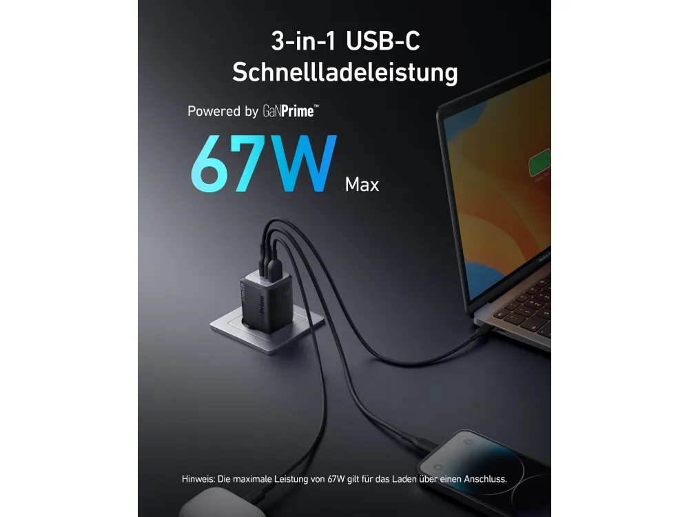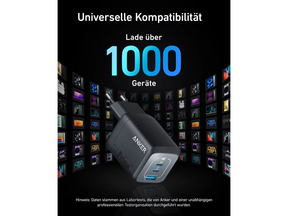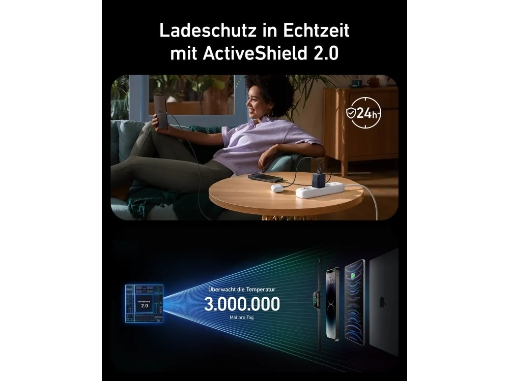 Kompakt, hurtigladning, for opptil 3 enheter, ActiveShield 2.0-beskyttelse, temperaturovervåking, PowerIQ-teknologi, Gallium Nitride (GaN), Programmable Power Supply (PPS) mulighet