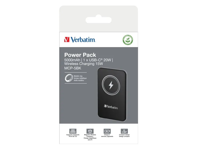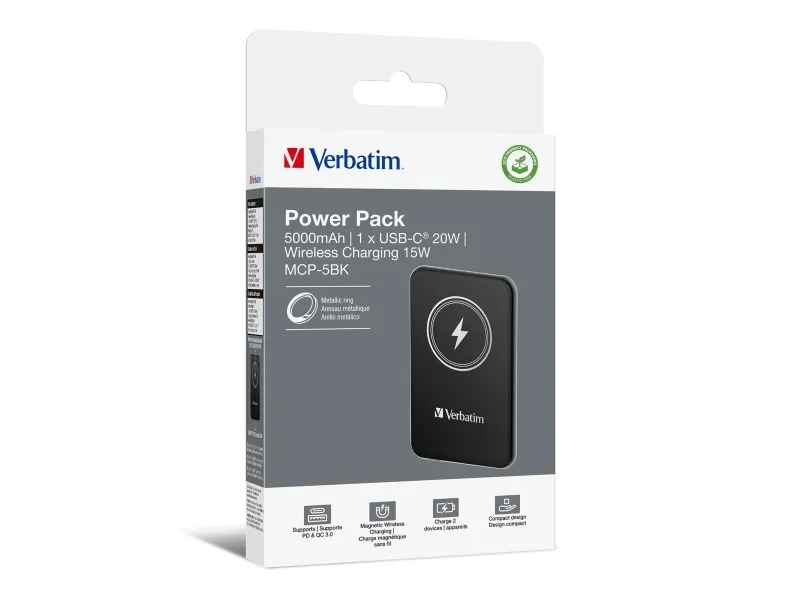 2-year warranty comes as standard. Verbatim Charge 'n' Go Magnetic Wireless Power Bank 5000mAh Black. Battery capacity: 5000 mAh, Battery technology: Lithium Polymer (LiPo), Fast charging technology: Quick Charge 3.0, Wireless charging. Product colour: Black