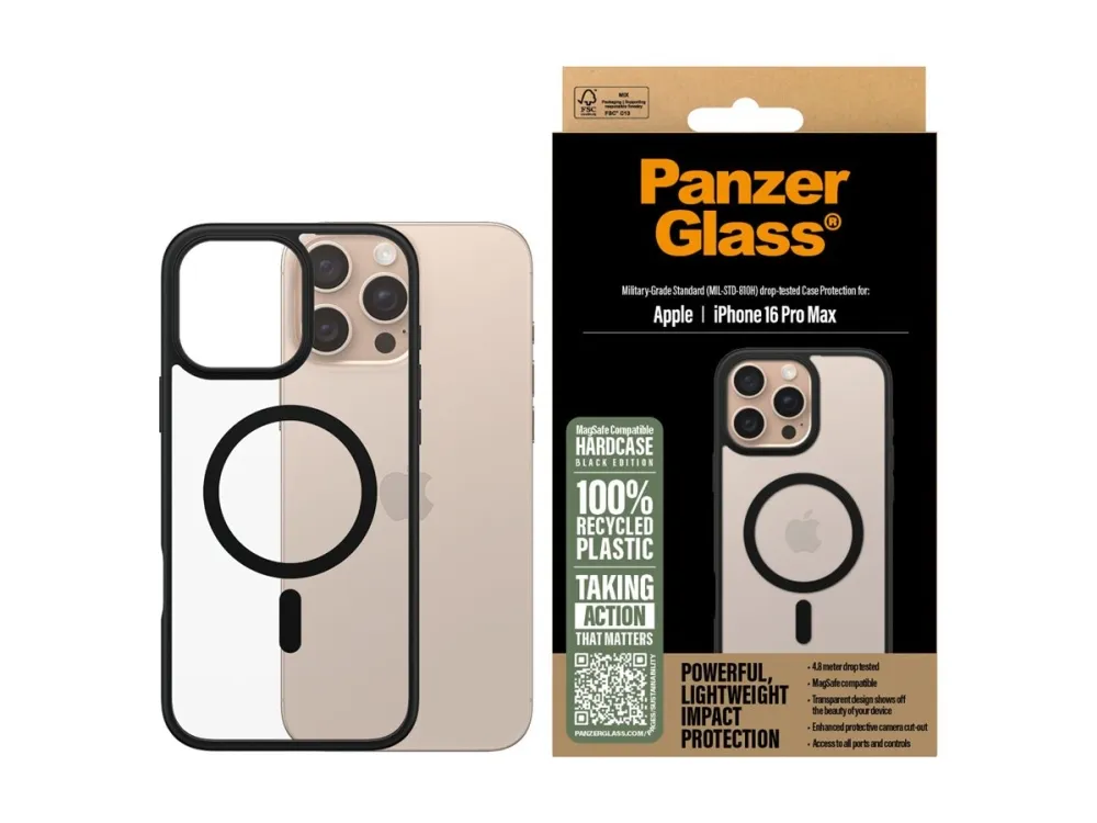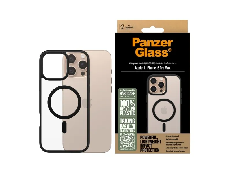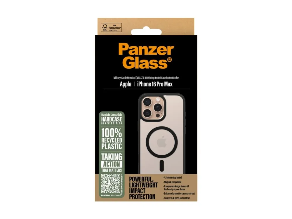 Want more impact protection with less impact on the planet? This PanzerGlass HardCase has a back cover made of 100% recycled plastic and keeps your phone safe from drops, shocks, scratches and most of whatever else life might throw at you. The case has even been drop-tested according to 4 x Military Grade Standard, which means it can withstand several drops from a height of 4.8 metres or a sitting-on-a-balcony-and-accidently-dropping-your-phone kind of height.? The HardCase protects and prolongs the lifetime of your phone so that one day you can pass it on to someone else who will love it just as much as you do. This is one way to work towards a more sustainable future.Anotheris to use less packaging: In 2024, we reduced the amount of paper in our PanzerGlass core product packaging design by an average of 66 %*. And of course, this product comes in recyclable FSC-certified box. The MagSafe compatible HardCase features a stiff, black tinted transparent back cover surrounded by a softer black frame. Both back cover and frame are anti-yellowing so your case will continue to look great day after day, even with heavy use. For extra protection, combine the case with a PanzerGlass screen protector and a PanzerGlass PicturePerfect or HoopsTM camera lens protector.? *Reduction from 2022-2024 measured by comparing selected products from the PanzerGlass core range.