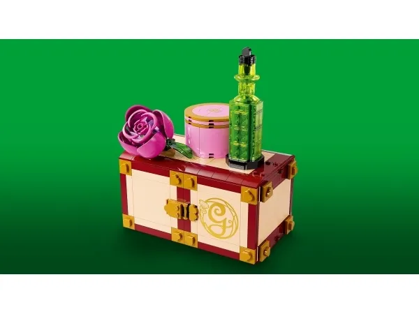 4. Mange detaljer – dukkehus-lekesettet inkluderer tryllestaver, parfymeflasker på en dreibar sokkel, skuffer og to av Glindas blomster – én som kan bygges som pynt på kofferten, og én liten til Elphabas hår