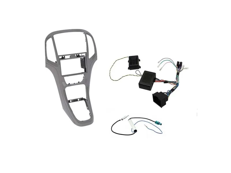 Komplet 2-DIN kit til Opel Astra J 2010&2015 med ramme i titangrå ramme, ratbetjeningsinterface med højttaler for at bevare advarselslyd, samt antenneadapter.