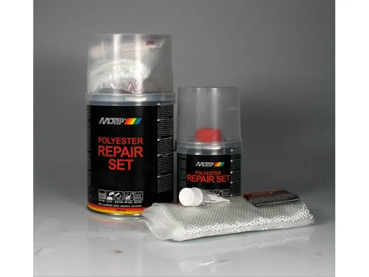2-komponent polyester harpiks, der skal anvendes i kombination med den medfølgendeglasfiber måtte og glasfiber stykker. Til at udfylde huller i overflader af stål, aluminium, træ,beton og polyester. Også velegnet til at skabe objekter, hvor der skal bruges en form.Polyester harpiks er elastisk og modstandsdygtig for kemikalier og vejrpåvirkninger.MoTip Polyester Harpiks har fremragende klæbeevne og er efter hærdning kun mekanisk slibbar.