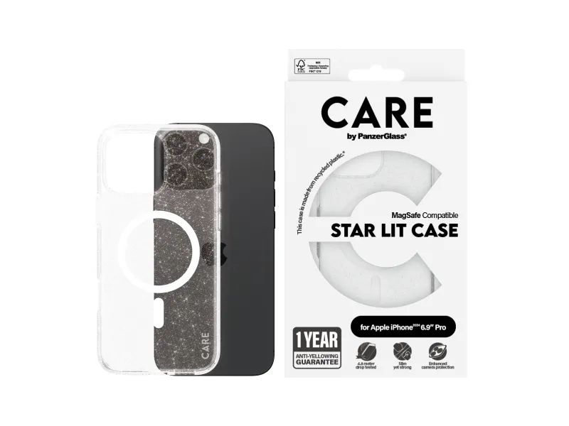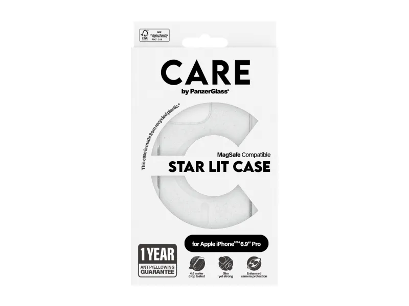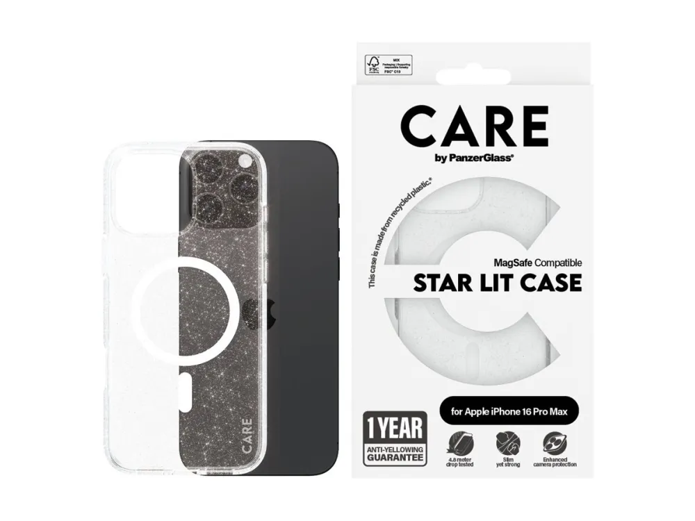 One of our most popular cases, offering phenomenal, eye-catching protection for the red carpet and those unforgettable glittery nights. Every angle and corner has been drop tested at 4.8 meters. The Star Lit case, made from recycled plastic, is designed for wireless charging and MagSafe compatibility. And it comes with our 1 Year Anti-Yellowing guarantee – no questions asked. Shine like a diamond with this beautiful Star Lit case and enjoy superior protection against drops and accidents whenever, wherever. It even includes enhanced camera protection, so your selfies and photos will always shine. DARE TO CARE CARE is a playful, protective international tech and lifestyle brand featuring a range of products created using the highest quality materials and influenced by fashion, art, and music. We care about people and the world we live in. We care about sustainability and self-expression. And we care about tech and extending its lifetime. So protect you tech in style and show the world you CARE.