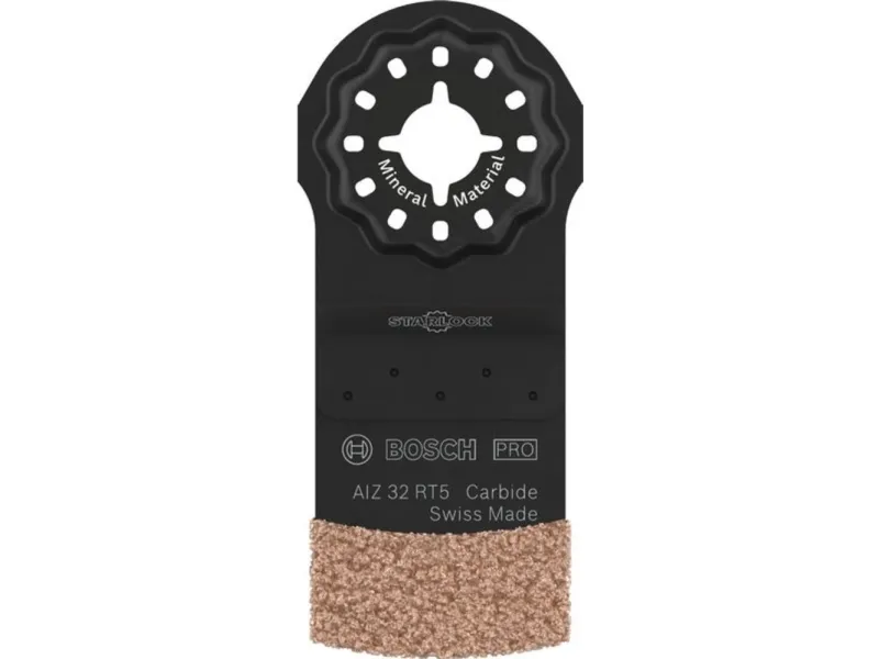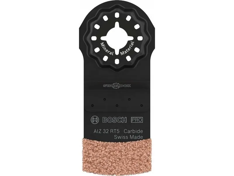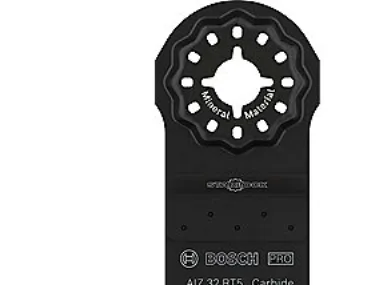 PRO AIZ 32 RT5 ark til multifunktionsværktøjer, 2,5 x 32 mm Mere funktionalitet ved udskiftning af fliser! Dobbelt design for maksimal effektivitet når det handler om at fjerne ødelagte fliser, er multifunktionsværktøj meget effektivt. Professionelle har dog alligevel brug for 2 ark. Takket være det smarte design kan du med PRO AIZ 32 RT5 få fugerne rundt om små fliser og slibe de gamle mørtel bagved. PRO AIZ 32 RT5 dyksavklinge anvender et dobbelt design fra Bosch for maksimal effektivitet: Det klarer arbejdet med to standardblade. Takket være det robuste korns fungerer det desuden effektivt ved arbejde med slibende materialer.
