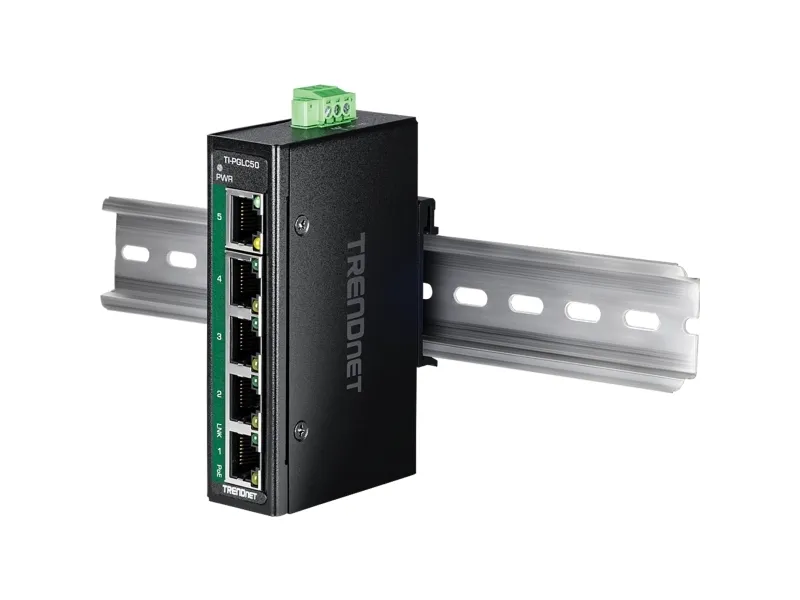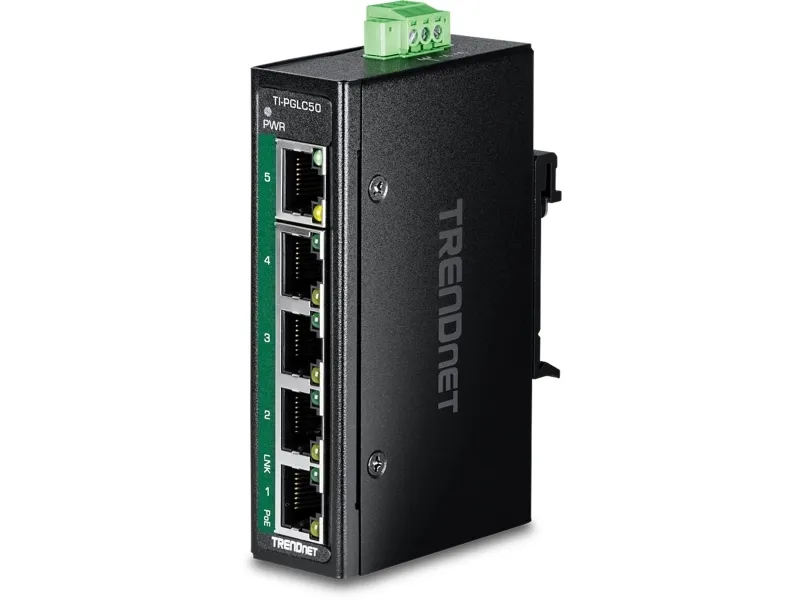 TRENDnet TI-PGLC50 - Version V1 - switch - industrial, mini - 4 x 10/100/1000 (PoE+) + 1 x 10/100/1000 - DIN-skinnemonterbar, veggmonterbar - PoE+ (90 W) - TAA-samsvar - for P/N: TI-S12048, TI-S15052